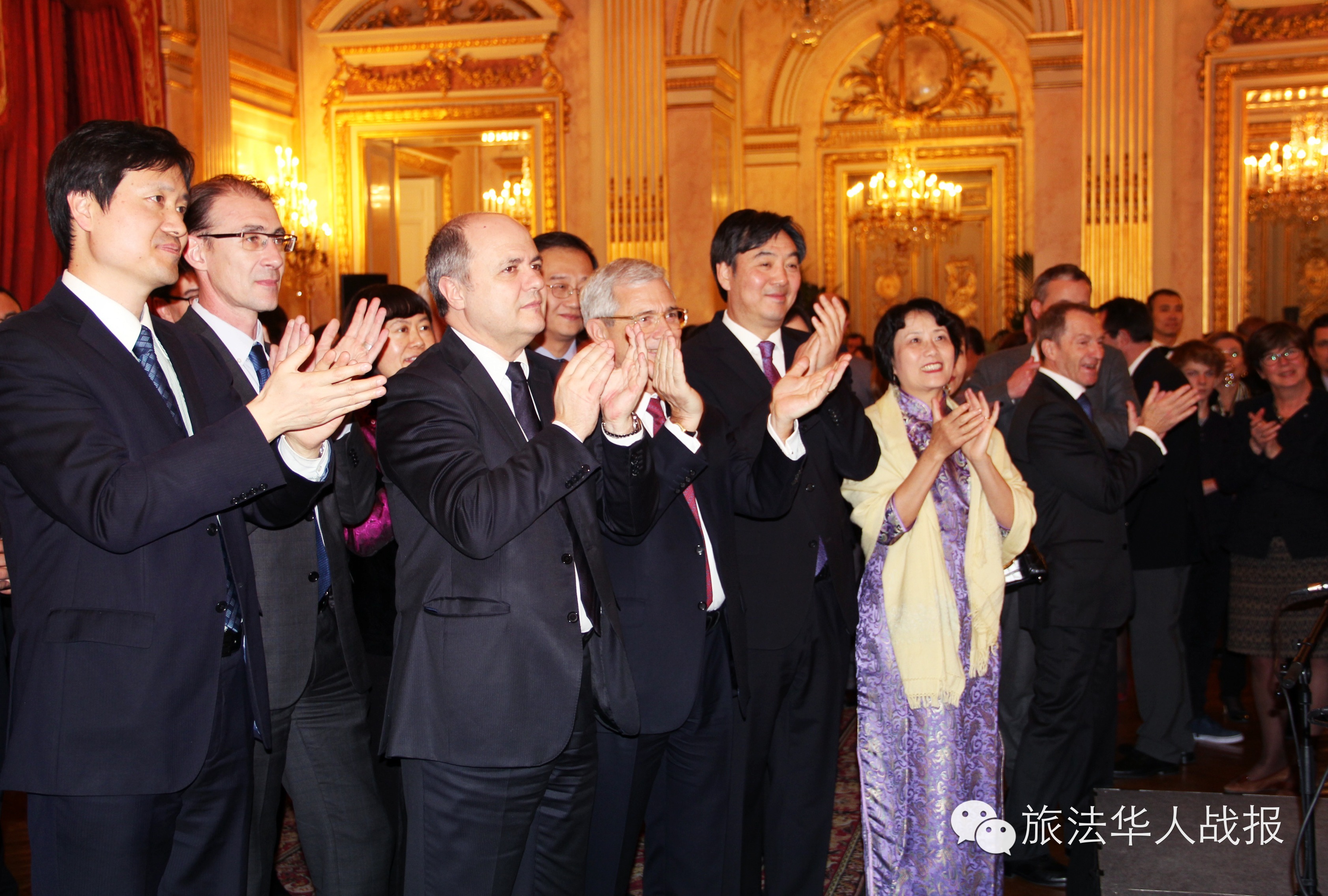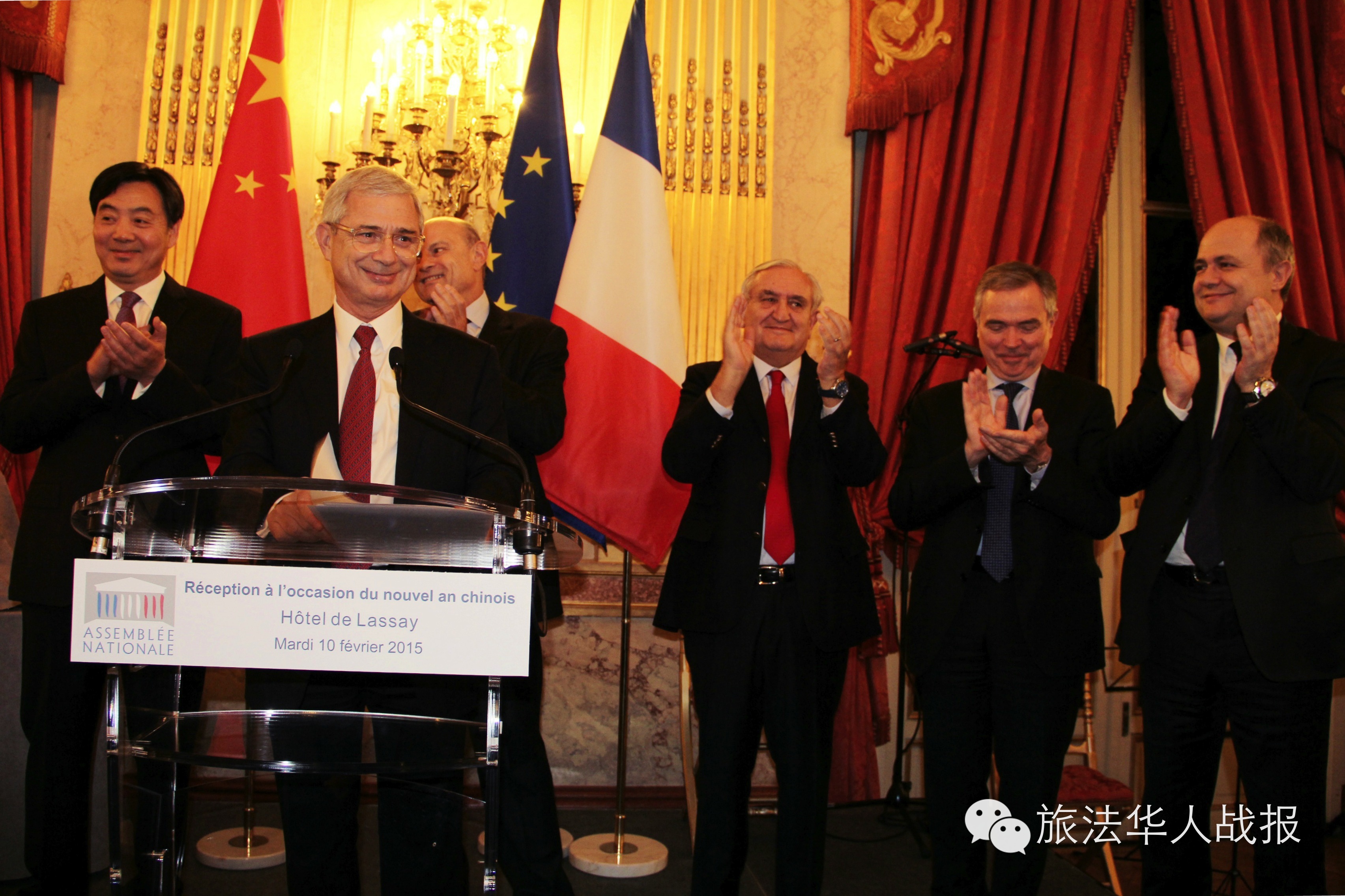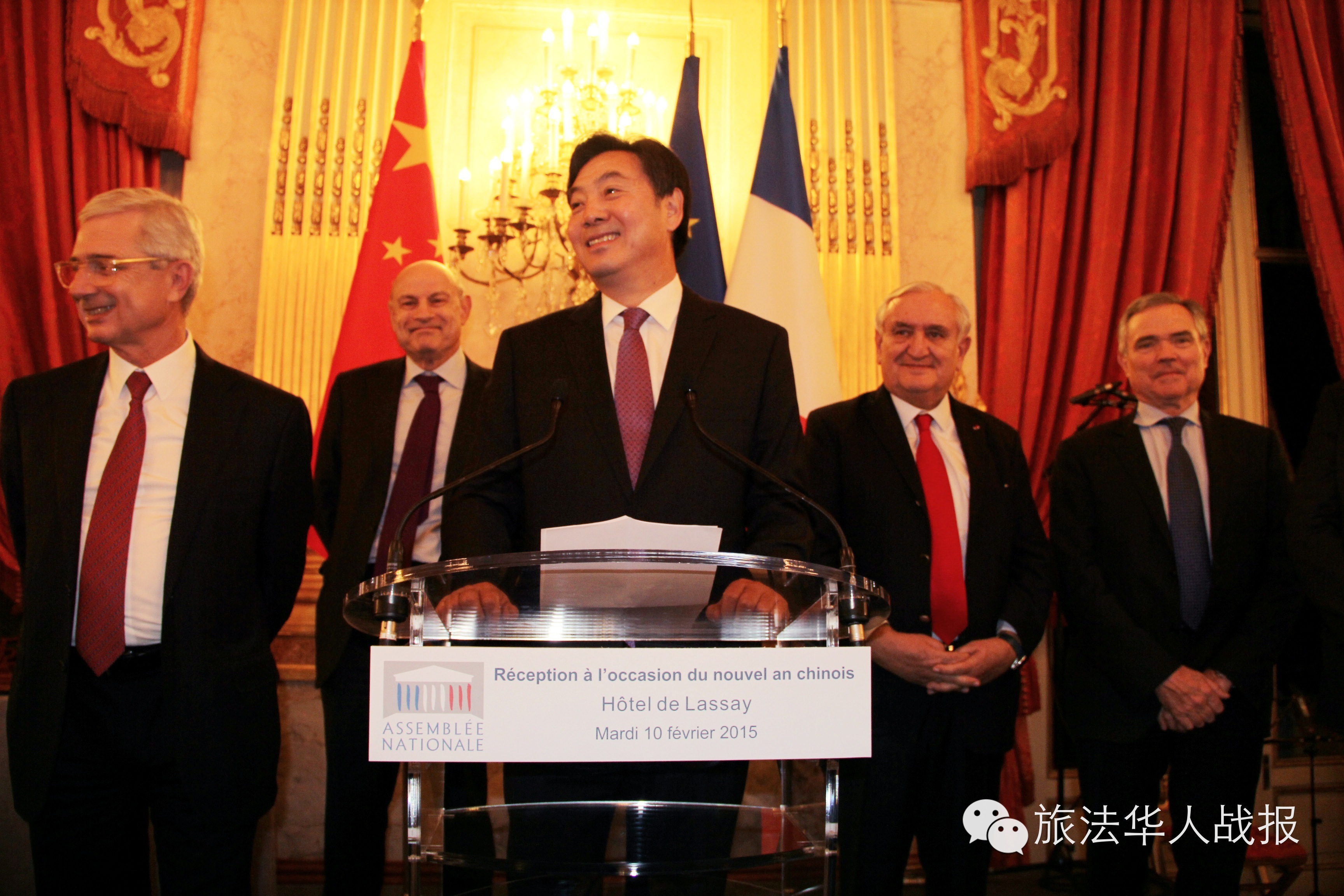 法国国民议会议长巴托洛纳(Claude Bartolone)、中国驻法大使翟隽、法中友好小组主席勒鲁(Bruno Le Roux)分别发表致辞。法国前总理拉法兰(Jean-Pierre Raffarin)、前议长阿夸耶(Bernard Accoyer)、国务秘书勒甘(Jean-Marie Le Guén)、巴黎大区工商会主席盖伊(Pierre-Antoine Gailly)、巴黎十三区区长顾梅(Jérôme Goumet)和巴黎华人市议员陈文雄(Buon Tan)以及众多国会议员和法国企业界领袖、中国驻法使馆外交官、中资机构、华侨华人代表300余人欢聚一堂。