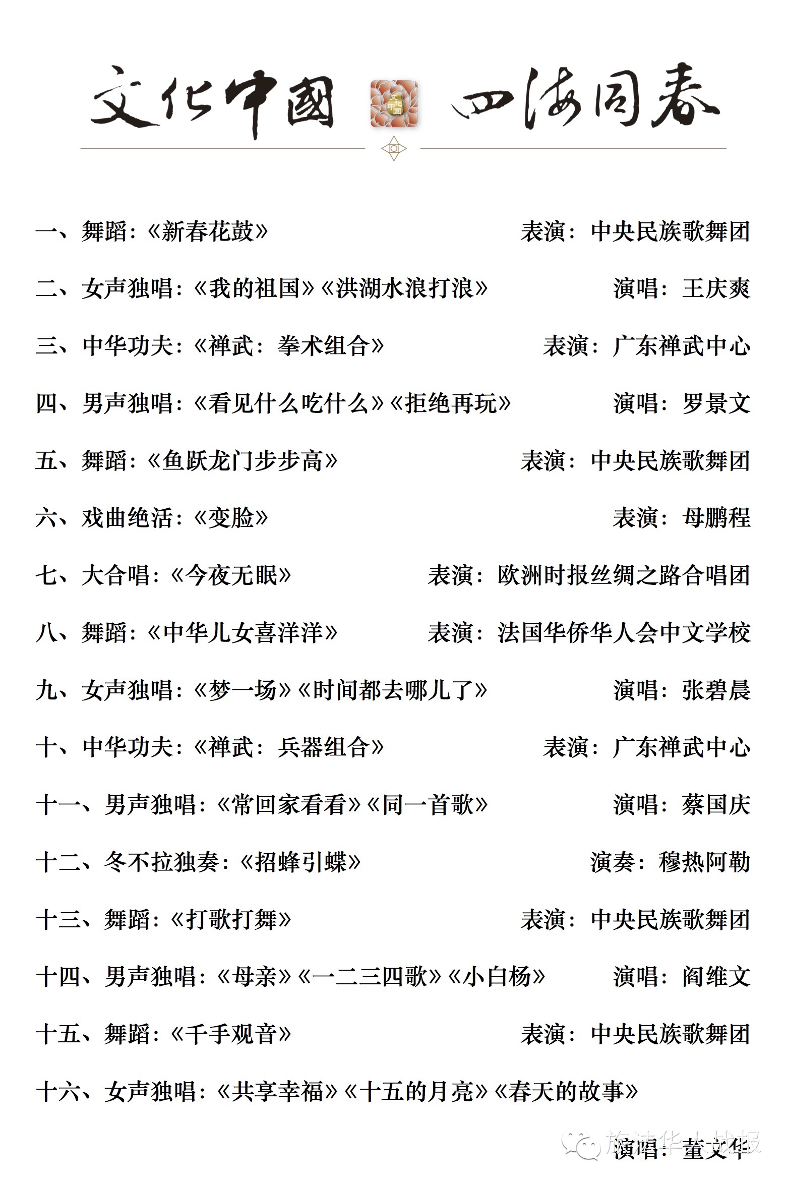 据悉,本次2015“文化中国·四海同春”赴欧洲艺术团将到访英国、法国、意大利三国,在伦敦、巴黎、爱丁堡、罗马、米兰等五座城市演出六场,巴黎是巡演的第二站,国侨办主任裘援平将亲临现场。 前瞻:四海同春节目单