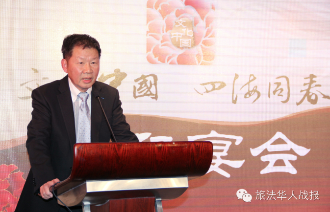 法国华侨华人会主席池万升代表旅法侨界致辞,向远道而来的艺术团一行表示热烈欢迎。池万升表示,旅法侨界和法国各级政府正在轰轰烈烈地庆祝中国传统佳节,此时国侨办组派“文化中国·四海同春”艺术团来欧洲巡演,为侨胞带来祖(籍)国的问候和祝福,为法国的春节庆祝活动增光添彩,这是令侨界翘首以盼的喜事。长期以来,国侨办关心关注海外华侨华人的事业发展和生活质量,每年组派艺术团来海外慰侨,这是“以人为本、以侨为本”的具体体现。艺术团一行在阖家团聚的节日里来到异国他乡慰籍侨胞的爱国思乡之情,这份付出令侨胞感动,对此特致诚挚的感谢,预祝演出圆满成功。