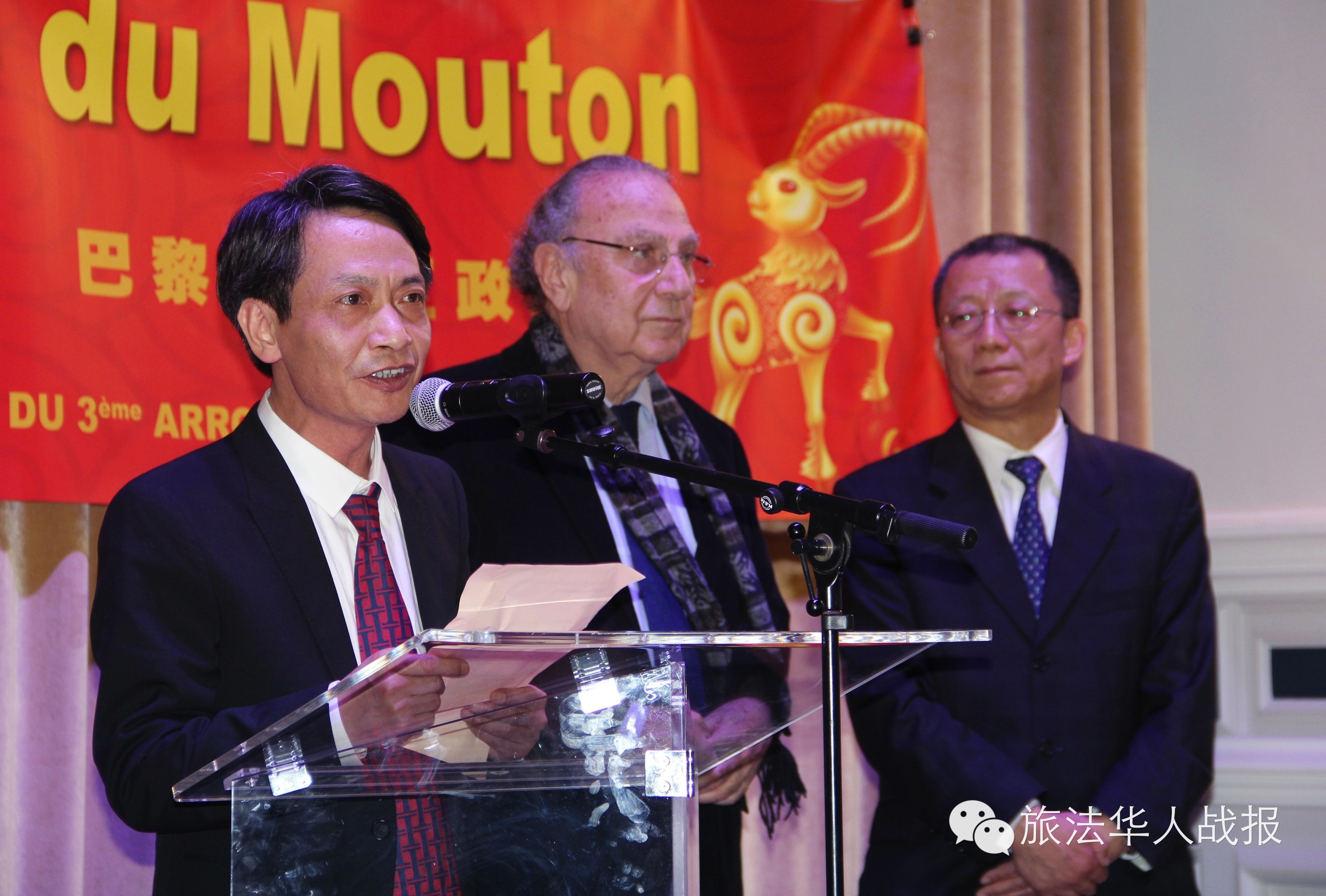 (新欧洲战报记者 鲁佳)2月26日大年初八,法国华侨华人会携手巴黎三区政府共同举办乙未羊年春节联欢会。华侨华人会主席池万升、三区区长Pierre Aidenbaum,中国驻法使馆领事部主任李平公参分别发表致辞,向三区居民和华人华商致以新春的问候。之后,与数百观众一起在区府节日大厅欣赏了一台由中法艺术交流协会安排的精彩表演。
