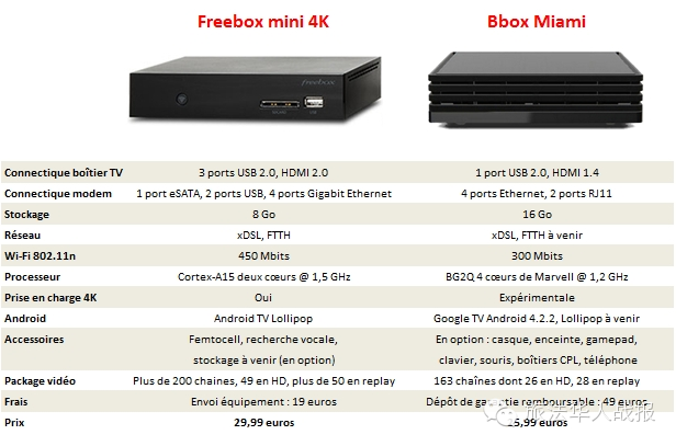 Free电信集团创始人格扎维埃·尼埃尔告诉记者,“我们缩小了Freebox的体型,用户可把新型迷你电视盒放在柜子的抽屉里,用遥控器来操控。”此外,电视盒遥控系统里安装了麦克风,用户选择电视影集、影片或节目时,可以向用户提供相关建议,用户也可在电视盒上下载视频游戏,这时遥控器可以当游戏机的手柄。 尼埃尔强调,这是法国首家电信公司在互联网、固定电话及电视“三合一”(Triple Play)电信产品中纳入与谷歌电视台连接的Android TV平台,也是首次提供可接收4K数字画面的电视盒,其清晰度比HD规格高4倍。