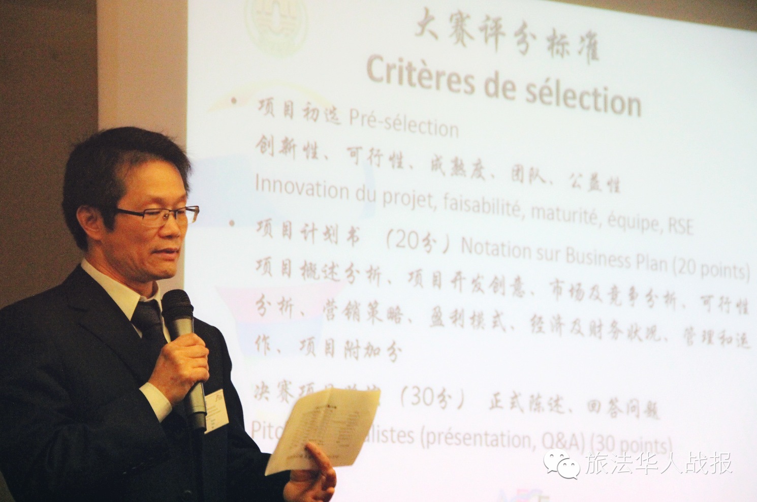 大赛组委会负责人李天伦博士代表主办方致词,对大赛进程、参赛方式、奖励机制做了全面介绍。据介绍,大赛于今年3月启动,4月的初赛阶段提交参赛申请,5月1日至7月10日的复赛阶段提交项目计划书,8月29日举办决赛,历时共六个月。大赛面向全法范围内拥有科技产品或服务文化项目并有志于在法国或中国创业的个人、团队或初创型企业,同时邀请对前往中国创业感兴趣的法国友人参赛。 大赛将评选出一等奖1名,奖金1500欧元;二等奖2名,各奖600欧元;三等奖5名,各奖300欧元。优胜项目还可以优先参加苏州市、区、县级领军人才的评选,最高可获得400万元人民币的创业启动资金以及免费的工作场所和人才公寓。