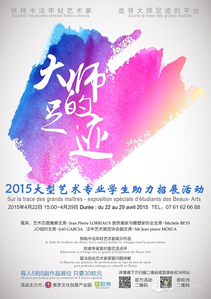 (新欧洲战报讯)2015年4月22日至29日,由奥奈文化艺术创意产业园主办,中国驻法使馆文化处、法国奥奈市政府支持,商桥国际、新欧洲承办,荣力欧洲、集美集团、中国书画院、双赢杂志、艺术态度画廊、BDMC画廊、奥奈艺术家与雕塑家协会、法中艺术展览协会、奥奈艺术协会、桑利斯独立艺术家协会、中国文化指南、艺术·形态·色彩协会共同协办的首届奥奈春节艺术沙龙展在奥奈文化艺术创意产业园举办。 展览共邀请200位法国当代艺术家及10位在法国学习艺术的中国学生共同参加,展出作品2000余幅,此次展览为首届由华人举办的法国艺术沙龙盛宴,并在5月初选送150幅优秀作品由奥奈文化艺术创意产业园负责人、商桥国际总经理刘玉杰女士携艺术家代表5人前往中国山东、北京、上海、深圳继续为期6个月的巡展,为中国大众展示法国优秀当代艺术作品。 据此次展览的策展人也是奥奈文化艺术创意产业园展会策划部负责人范子毅介绍,本次参展艺术家以法国当地职业画家为主,选择他们近期创作的以当代绘画与抽象画为主的油画作品,同时也展出法国当地优秀雕塑、摄影、多媒体、插画、版画作品。 说起法国艺术,我们最先想到的是位于巴黎的凯布朗利博物馆、卢浮宫、奥赛博物馆、现代博物馆、蓬皮杜艺术中心、巴黎毕加索博物馆、罗丹博物馆等等展馆,它们为我们展示了整个世界艺术史长河中法国艺术不可取代的位置。每年在巴黎大宫、卢浮宫·卡鲁塞尔举办的世界艺术展也汇聚了来自全世界的优秀艺术家,为全球收藏家提供了很好的平台。此次法国奥奈春季艺术沙龙旨在为法国艺术家、艺术作品走进中国、开拓中国艺术市场为目的,以促进中法文化交流为己任,为中法艺术家提供一个更广阔、更自由的艺术交流和交易平台。 参加此次展览有来自中国湖南省文联副主席、书协主席何满宗先生,中国当代水墨大师关羽,还有来自法国及法国海外省马提尼克,以及西班牙、意大利、德国、比利时、韩国、老挝、越南等国家和地区的艺术家。 即日起,由奥奈文化艺术创意产业园奥奈春季沙龙筹备组组织的一支春季沙龙艺术委员会,将开始从这2000余幅艺术作品中挑选150幅参与中国展览的评选工作,委员会成员包括Jean-François COLLIGNON, 何满宗、马剑虹、叶星千、汪霏、范子毅、Jean-Pierre Lorrieau, Jean-Pierre VONG, Jean-Pierre Mosca, Myeong-Hee KIM。 值得一提的是,由奥奈文化艺术创意产业园与新欧洲共同主办的《大师的足迹》在法中国留学生展览也同期在奥奈文化艺术创意产业园举办,此次活动为在法中国留学生提供一个交流、学习的平台,并请专家开设中法艺术市场讲座、在法艺术家居留申请咨询等系列活动。 联系方式 奥奈文化艺术创意产业园展会策划部负责人 范子毅 电话:0033 6 79 06 15 91 邮箱:responsable.centreartaulnay@gmail.com