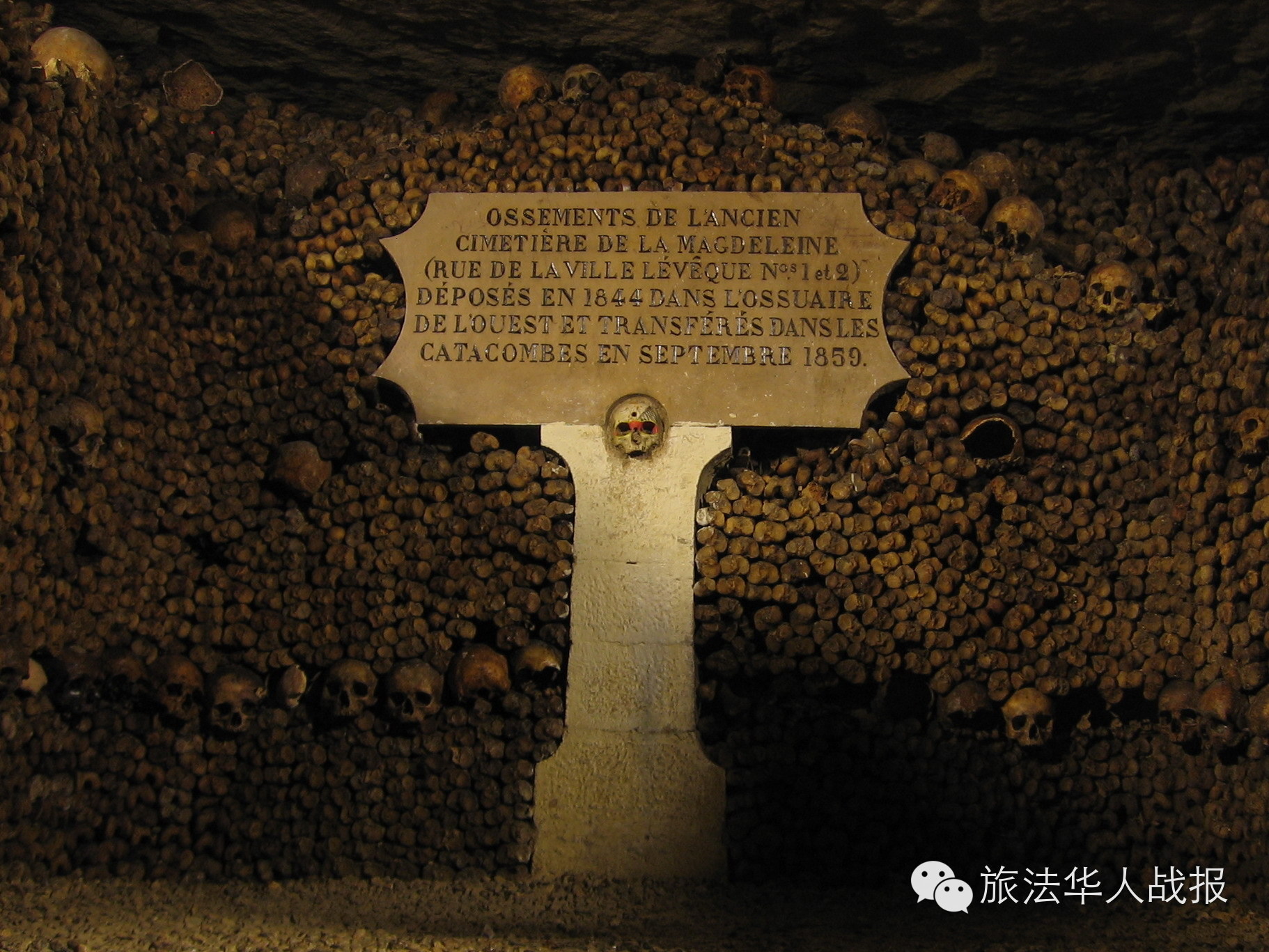 另外一处著名的地下景点就是巴黎地下墓穴(Catacombes de Paris)。它是巴黎一处著名的"藏骨堂" ,位于今天巴黎14区的丹费尔-罗什洛广场。原为地下石灰采石场。1786年,巴黎爆发瘟疫,为了解决墓地不足和公众卫生危机的问题,人们将埋在市区所有公墓中的尸骨转移至此。此后作为一个公墓一直使用到1814年。现已开辟为博物馆,有一小部分墓穴供公众参观。 墓穴在地下的深度大约是20米,比巴黎的排污管道和地铁隧道都要深,相当于一栋五层楼的高度。温度在14度左右,整个行走路线有两公里长,逛一圈基本需要45分钟。整条路线被分成Quarries(采石场)和ossuary(藏骨地道)两部分,据说后者容纳了近600万“巴黎居民”。总得来说,地下的通风设施和照明设施都很好,路线又是单程的,还有工作人员在地下守着,所以不用担心迷路。