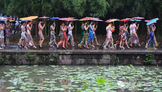 南京近百位女模身着旗袍在江心洲登台。