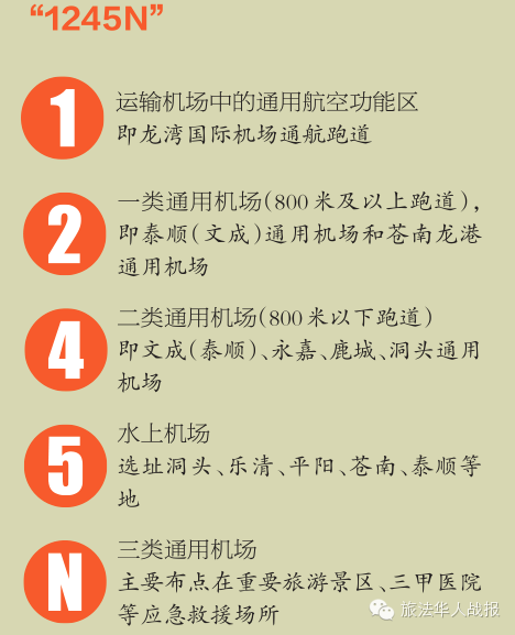 其中,短程商务飞行将开辟乐清—温州、洞头—温州、永嘉—温州、文成—温州、泰顺-温州、苍南-温州、平阳—温州之间的低空飞行航线。通过4至12座直升机或通用飞机运送客人,打造1小时空中交通都市圈。中长程商务飞行是指,航空器开展服务半径在300至600公里范围内的飞行活动。远程商务飞行是指服务半径超过600公里的飞行活动。 近期可吸引1至2家公务机运营企业入驻,开展商务飞行和通勤飞行。未来随着机场功能的不断完善和运营规模的壮大,可将龙湾国际机场打造成功能齐全的“华东商务航空运营基地”及“温商飞行服务基地”。 机场网:十几个机场分布各地 今后温州市通用机场的布局蓝图将如此绘就,概括之就是“1245N”: 一个运输机场中的通用航空区。即龙湾国际机场通用航空区,其通用跑道位于机场东侧,近期规划长度为2100米,为私人飞机、公务机等通用飞机提供起降服务。 两个一类通用机场,即泰顺(文成)通用机场和苍南龙港通用机场。泰顺(文成)通用机场跑道设计为800米,主要起降小型固定翼飞机,开展航空小镇、航空旅游、农林作业、私人飞行等通航业务;苍南龙港通用机场近期规划800米跑道,远期扩展到1800米,是以通用飞机试飞为主的综合性通用机场。 四个二类通用机场。文成(泰顺)通用机场、永嘉通用机场、鹿城通用机场、洞头通用机场,在初期按照直升机场进行建设,开展直升机托管、航拍、飞行体验、医疗救护等。 若干个三类通用机场。布局主要包括重要旅游景点、医院、百米以上高层建筑顶部(旧楼可寻找满足条件的设立起降点,新建的百米以上高楼宜设计楼顶停机坪)、应急避难场所以及森林消防、警务防卫、海上搜救等。 五个水上机场,泰顺水上机场、洞头水上机场、平阳水上机场、苍南水上机场、乐清水上机场。在此基础上,结合温州市域众多的湖泊和河流,在有条件的地方可多建一些水上机场,使温州在水上飞机运营和服务上率先实现突破。水上机场用于开展空中旅游、岛屿间通勤、水上飞机培训、应急救援、海上巡查等业务。