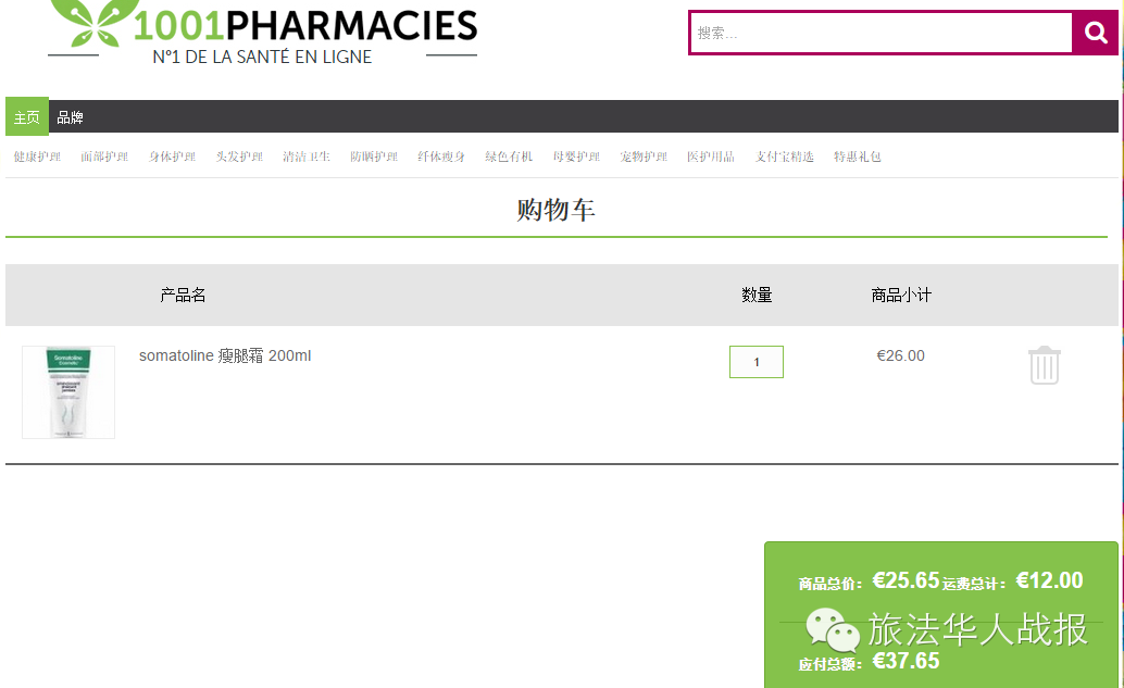 我们去模拟购物一下。主页君心水Somatoline家的瘦腿霜很久了,所以以此举个栗子。整体的选择加上购物程序和某宝十分相似,中国消费者还是容易使用的。 大家最关心的就是价格,你们随意感受下差别:规格为200毫升的Somatoline瘦腿霜,1001药房的价格是25.65欧,加上12欧的运费,总共您从银行卡里划去37.65欧,然后您就在家坐等着拆包裹吧!笔者跑到办公室旁边的实体药妆店打听了一下,价格为28.9欧,想想代购们加上运费和辛苦费,和网上的价格倒也差不了太多。 网站价格 实体店价格 据了解,1001药房的价格同步法国市场,不加收包装费、服务费、手续费等额外费用,登陆中国后还将推出优惠码、返利、专题、折扣等优惠活动。所以,强大的公司运作有着强大的价格优势。 不过,激动的心气儿过去之后,我发现这网站的产品种类确实少得可怜呐!举个例子,粉底/BB霜类别之下竟然只有两款,还都是Lierac的产品!卸妆产品类别下,法国药妆温泉水系三大经典品牌——雅漾、薇姿、理肤泉,处于三缺三的状态;热门大葡萄Caudalié和法国人喜欢的Sanoflore也难觅踪迹。嗯,隐隐感觉到,这是霸道总裁的范儿:买东西,不是看你要买什么,而是要看我有什么!