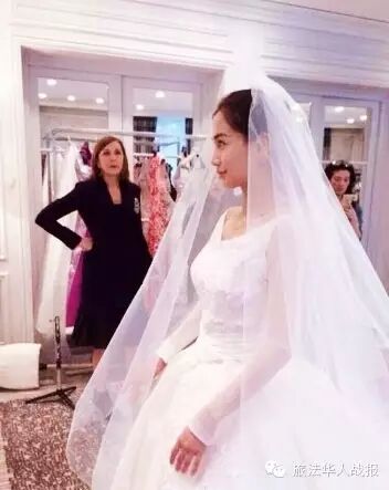 21日,网上也传出一张疑似baby在法国某婚纱店试装的照片,照片中她身穿纯白婚纱,脸上洋溢着幸福的笑容,看着镜中的自己,金发店员站在旁边,与此前传她将在法国拍摄婚纱照的说法不谋而合。