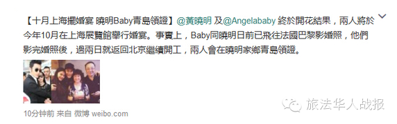 一直有网友爆料说,黄晓明和baby将于今年10月完婚,婚宴地点在上海,更曝二人已在黄晓明的家乡青岛领证。领证一说未得到进一步证实。另据港媒报道,两人大概半年前已锁定婚期和地点,在巴黎拍完婚纱照就会回青岛领证。