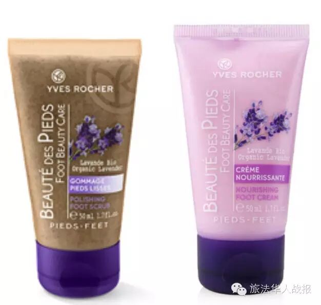 Yves Rocher薰衣草足部润泽滋养霜,折扣价4.15欧/50ml。Yves Rocher薰衣草足部嫩滑磨祛角质嫩足护足霜,3.2欧/50ml。他家折扣是常态。 其主要成分包括澳大利亚坚果油、有机薰衣草精油,为干燥粗糙的足部肌肤量身定制,为双足注入营养,使双足回复细腻柔软,适合任何肤质人群,尤其久站或久坐、爱穿高跟鞋的人群,足部压力大,肌肤粗糙,角质过厚,用这款产品再好不过啦! 用法也很简单,每天清洁双足后,取适量按摩从脚趾至脚踝。如果希望获得更好的功效,可以晚间在双足涂抹厚厚一层,并穿上棉袜,能带来超凡的润泽功效。 去角质霜是珠光淡紫色、丰盈霜状质地,滋润、柔软舒适的磨砂膏有幽雅薰衣草香,轻轻按摩后产品迅速被吸收。