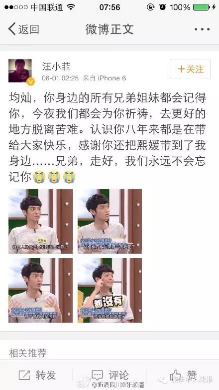 6月1日凌晨,32岁的台湾艺人安钧璨因肝癌去世。 [attach]2282781[/attach] 大S的老公汪小菲第一时间发文悼念,并晒出安钧璨近日录制《康熙来了》的画面。汪小菲写到:“均灿(钧璨),你身边的所有兄弟姐妹都会记得你,今夜我们都会为你祈祷,去更好的地方脱离苦难。认识你八年来都是在带给大家快乐,感谢你还把熙媛带到了我身边……兄弟,走好,我们永远不会忘记你。”