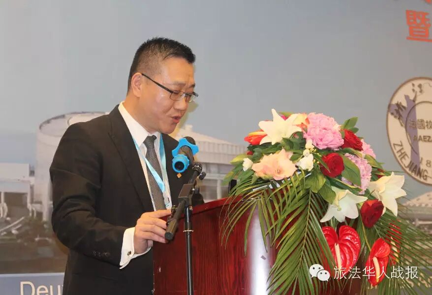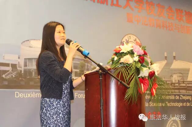 中国驻法使馆教育处一等秘书赵静梅发表致辞,代表教育处马燕生公参对浙江大学校友联谊会的召开和中法科技与创新论坛的举办表示热烈祝贺。她介绍了中国驻法使馆教育处的工作,着重强调了校友会的三大服务功能:服务校友、服务母校、服务社会。赵静梅指出,法国浙江大学校友会是一个极具亲和力和凝聚力的平台,开拓创新,积极实干,不但有效连接新老留学生,连接学界与业界,也为中法两国的交流做出很多贡献。