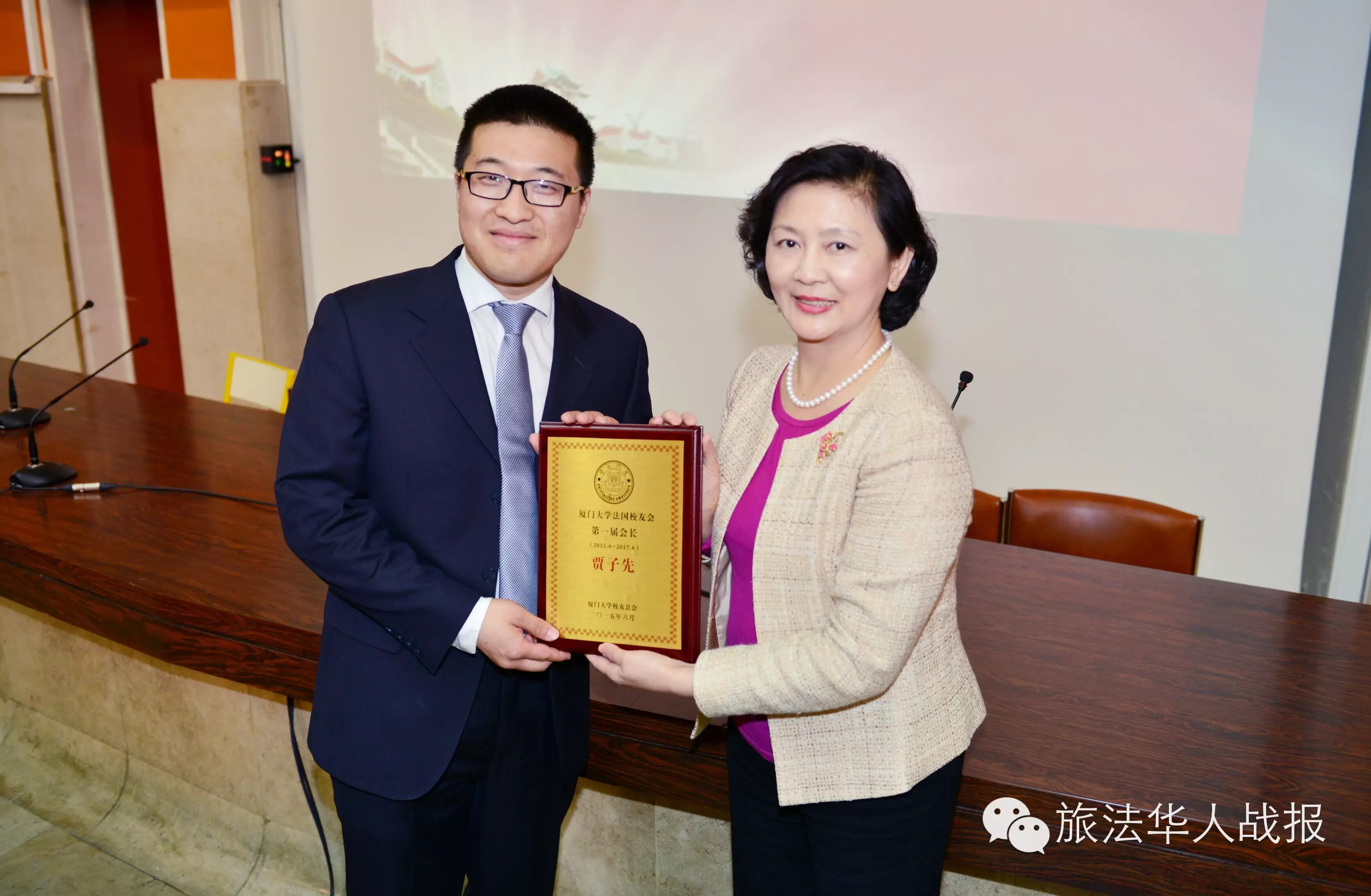 厦门大学副校长詹心丽向第一届会长贾子先授会长牌。 随后,贾子先会长代表第一届理事会致辞,首先感谢了母校厦门大学领导和校总会对成立活动的倡议和支持,随后感谢了中国驻法使馆对成立大会的关心。此外,他对法国校友会筹委会含辛茹苦的工作也表示了由衷的感激和赞赏,称在所有人的精诚团结下,才使得这一天真正成为具有历史意义的一刻。贾子先表示,厦大法国校友会将秉承“热爱祖国,热爱母校,全心全意为校友服务”的宗旨,从服务母校、服务校友、服务中法关系三方面开展工作。