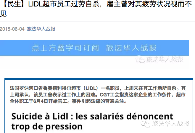 法国是传说中全球工作环境最轻松的国家之一,每周法定工作时间仅35小时,员工每年还享有五周带薪假期。但法国人还是觉得他们的工作任务太繁重了,压力实在太大了! 有些人觉得压力大到已经活不下去的地步。上周三,战报君也曾报道过,法国罗讷河口省鲁赛镇LIDL超市一名33岁的职员,因为“职业疲劳”在工作场所自杀了。然后全超市的员工罢工了。