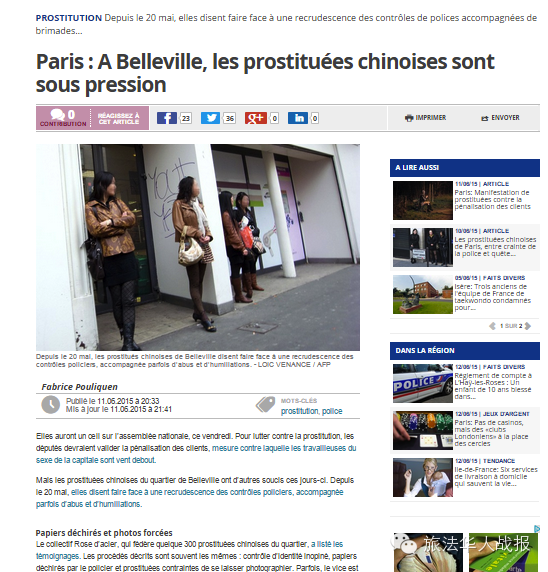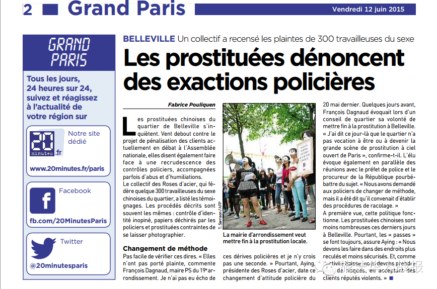 昨天,法国媒体又将目光对准了站*街女,说从5月20日起,巴黎警方在美丽城一带加强了警力,而且6月12日,为了打击卖淫,国民议会决定加重对嫖客的处罚,这项抵制性工作者的措施呼之欲出。站*街女感到生存空间不断被压缩,担心今后将面临更加严峻的局面,于是开始展开新一轮抗议。 新欧洲战报记者 | 王希 吴忱 站*街女称遭遇不公对待 据《20 minutes》报道,由300名中国妓女组成的“钢铁玫瑰”(Le collectif Rose d’acier)性工作团体发声说,经常遭遇临时的身份抽查,而出示的身份证件会被警察撕毁,她们害怕被捕和拍照。有的时候,伤害还要更大一些,依依(化名)说到,“被撕毁证件后,我继续往前走着,但是没走几米,警察又跑过来抓住我问我要新的证件。”丽丽(化名)指出,有一次有个警察直接向她要求提供性服务。 就此,巴黎19区区长达纽(François DAGNAUD)表示,很难判断她们这些话的真实性,很难相信这些说法。 警方加强了检查力度 “钢铁玫瑰”的主席阿英(化名)指出,警察态度的变化是从5月20日开始的。几天前,达纽区长提出要重新整治美丽城一带的站*街女现象,“美丽城并不想成为一个在巴黎地区的妓女聚集地。” 据悉,巴黎警察局长和检察官也开会商讨,如何杜绝美丽城街区的站*街卖淫现象。警察们已经获得新的指示,将就此采取更严厉的措施。