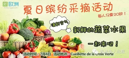 时间:6月20日周六 8h15-20h 摘果子 夏天到啦!最惬意的事,莫过于怀抱各种新鲜清爽的水果大块朵颐。嫌弃巴黎买到的果蔬太贵不新鲜吗?那就亲自来农场挑一挑吧!新欧洲携手游游旅行社带大家去摘水果,采蔬菜,游城堡。 水果是自己从果园里亲手采摘,那份甜美一定无可替代。邀小伙伴三五成群,或者带着家人孩子深入田间地头,欣赏成熟果蔬娇嫩欲滴的俏模样,再从枝头藤间将他们小心翼翼采进自己的篮子。即使挥汗如雨,那份最终得来的满满当当和混合着泥土清香的瓜果之甜无可比拟!