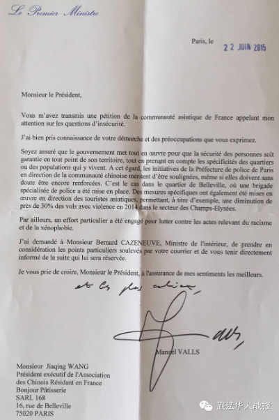 瓦尔斯在信中列举了巴黎警方为保障华裔群体安全所做的积极努力,并表示,还会继续在这方面加强工作。针对亚裔游客的安全问题,瓦尔斯指出,法国政府已制定并施行一些专门措施,使发生在巴黎香榭丽舍大道上的抢劫案件在2014年下降了30%。此外,瓦尔斯表示,法国政府也正在努力解决有关种族歧视和排外情绪等问题。在回信的最后,瓦尔斯指出,他已要求内政部长卡泽纳夫关注在法华侨华人安全,并将相关事宜告知法国华侨华人会执行主席王加清。 据悉,7月7日,法国内政部长卡泽纳夫将与王加清等代表会面,了解“反暴力,要安全”万人签名活动的进展,倾听旅法华侨华人对于安全的诉求。 张海平强调,旅法华人一直遵纪守法并积极融入,华商致力于促进中法贸易往来,提高法国的就业率,华人的融入带给法国新的文化活力,创造了文化的多样性。近年来,华人积极参政议政,对法国社会的贡献不容忽视。同时,旅法华侨华人和中国游客遭受本地治安日益恶化的威胁。旅法侨界在安全问题上团结一致,将继续与法国各界联系沟通,发出华人的声音,维护共同的权益。 来自旅游业界的声音 本次论坛也邀请到了旅游业、酒店业的资深人士,他们从实际经验和多年来的经历出发,与到场观众分享了旅游第一线的安全资讯。