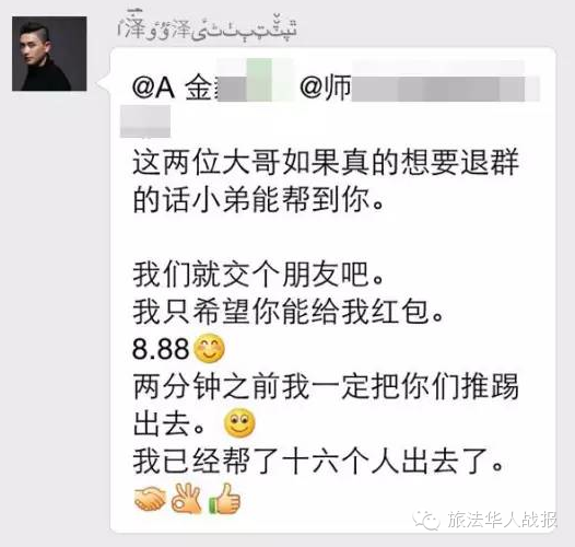 微信群红包讹钱 据《都市快报》报道,最近有微信用户接受群聊邀请,加入一个名为“金融群”的微信群,加入之后不久,发现群主海发各种垃圾信息,而未经群主同意,群友无法退群:只要点击右上角退群图标,微信马上闪退,手机界面回到桌面。