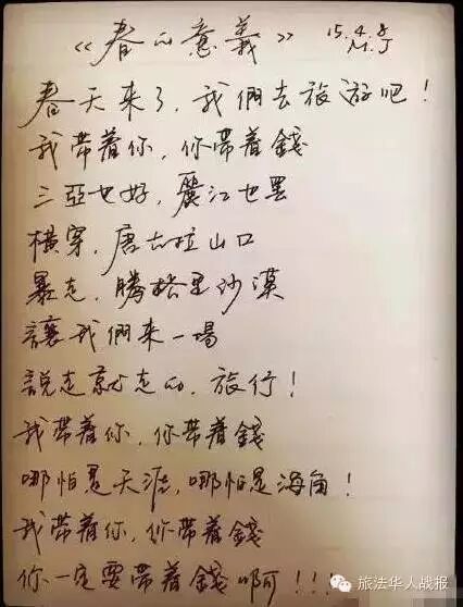出处:据说,这句话是根据网上一首原创小诗演绎而来。一位上海的妈妈给正在上大学的孩子写了首诗,原诗是“春天来了,我们去旅游吧!我带着你,你带着钱,三亚也好,长江也罢,横穿唐古拉山口,暴走腾格里沙漠。让我们来一场说走就走的旅行!我带着你,你带着钱,哪怕是天涯,哪怕是海角!”高大上的诗意遇上“你一定要带着钱”的现实,不少网友读着读着就乐了。现在成了各位的女朋友的口头禅…… 用法:重点无一例外都得是“我带着你,你带着钱”! 5世界那么大,我想去看看