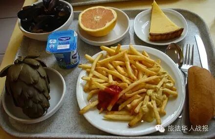 法餐一般包括汤或前菜、主菜、甜点。法国大学食堂供应的菜式大抵也是如此。自助式,所有东西摆在那里,想吃什么自己选。一般可以选一道主菜,意大利面、牛排薯条、鸡腿什么的都有;附菜通常可以在甜点、酸奶、奶酪之类里面选择两三样,搭配小碟沙拉。如果选拿饮料,一份饮料往往也算一道附菜。面包可随意拿取。具体规则,每家餐厅有所不同,但也是大同小异。 至于口味,我一直觉得法国大学食堂的菜做得蛮好吃的。而且气氛好,满眼都是穿着衬衫球鞋牛仔裤的学生们,朝气蓬勃,和商务应酬或去高级餐厅是完全不同的气氛。如果有机会,还想去试试。 [attach]2300562[/attach] 而且有卫生和健康保障。法国规定,学校食堂每周至少一顿饭要使用绿色食材烹饪。法国对绿色食品有严格规定,产品有专门标识,要求完全没有使用杀虫剂、农药等化学物品。 而且,而且,价格真的超级划算!持有学生证或大学校务机构CROUS发放的卡,可以购买优惠票,享受政府补助后的价格,如上所说包括前菜主菜和甜点的一餐,只用3.2欧! 这是什么概念?我在巴黎一直念的私立,不附设大型学生餐厅,每餐和小伙伴们去附近的私人餐厅或快餐店,一只最简单的三明治或panini也要3欧多: