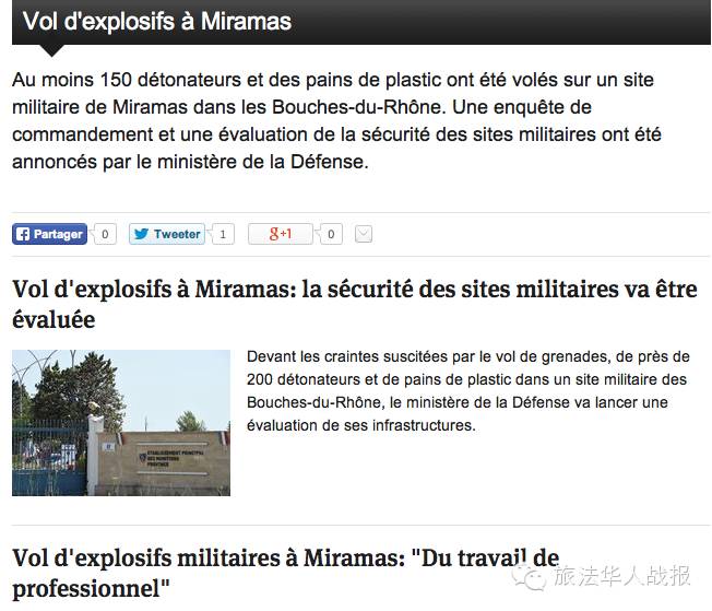 反恐警戒级别调至最高 中新网援引美联社报道称,目前,法国宪兵队已介入调查。据宪兵介绍,这批军火或在当地时间5日夜间至6日凌晨的时候被盗,窃案发生的军事基地位于法国城市马赛西部的米拉马斯。 据悉,这伙窃贼是通过破坏军事基地外围的铁丝网后,溜进了存有炸药的区域,其作案手法非常专业,不排除或与恐怖组织有关。 法国当局对此次事件十分重视,法国安全机构与国防部官员已于当地时间7日召开紧急会议。目前,法国已将反恐警戒级别调至最高。 不排除将有自杀式恐袭 根据法国议员齐欧堤(Eric Ciotti)主导的监视极端分子委员会近日提交的报告,反恐专家不排除法国境内发生自杀式袭击的可能性。