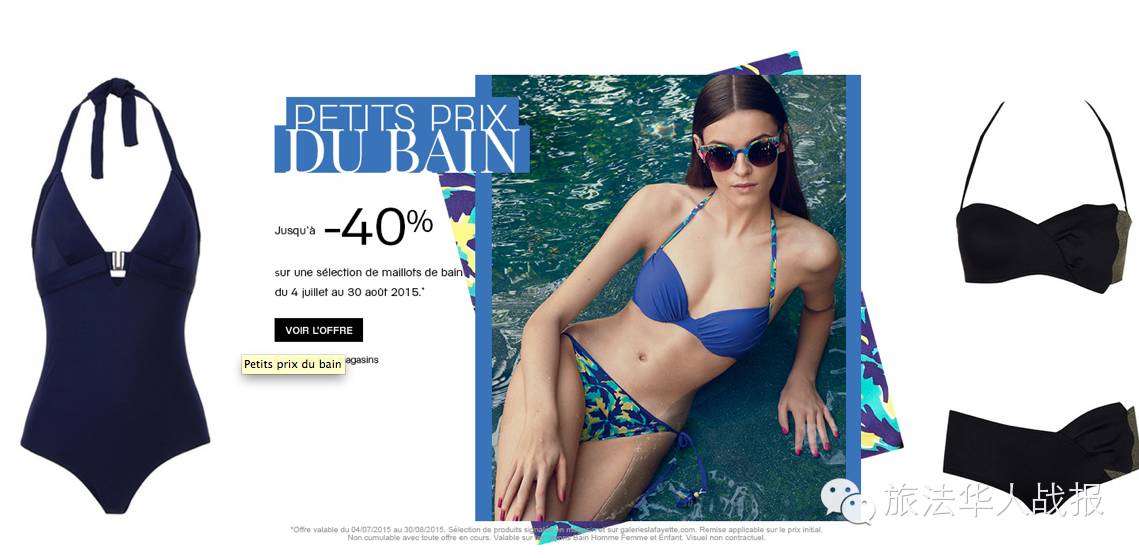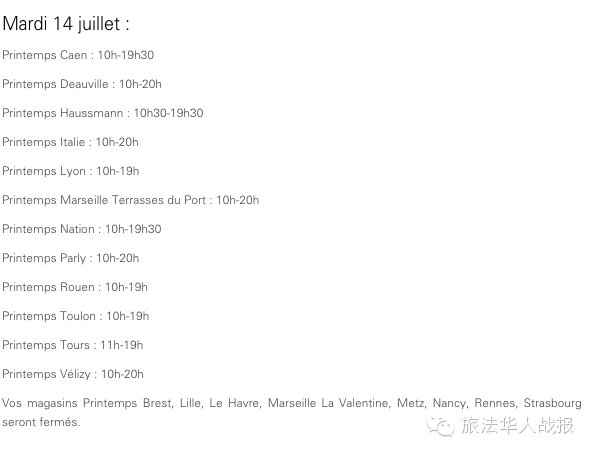 7月末到8月末,正是法国vacance的季节,很多人的目的地都是南法、摩纳哥、希腊、意大利或西班牙海边。必不可少的就是沙滩衣和泳装,所以老佛爷也适时推出泳装特价,7月4日至8月30日,泳衣精选减40%。 Printemps 春天百货也发布了通告,明日照常营业: