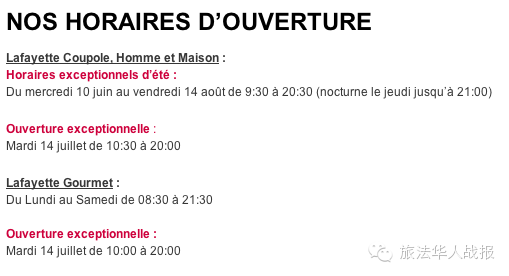 (新欧洲战报记者 鲁佳)虽然明天就是7月14号法国的国庆节,亦即法定假日,但正值Soldes大减价期间,一年到头就指望这次打折经济了,所以法国一众大型商场照常开门营业。 Galeries Lafayette 比如老佛爷商场,国庆节开门时间与往日一样,从上午10点至晚20点。