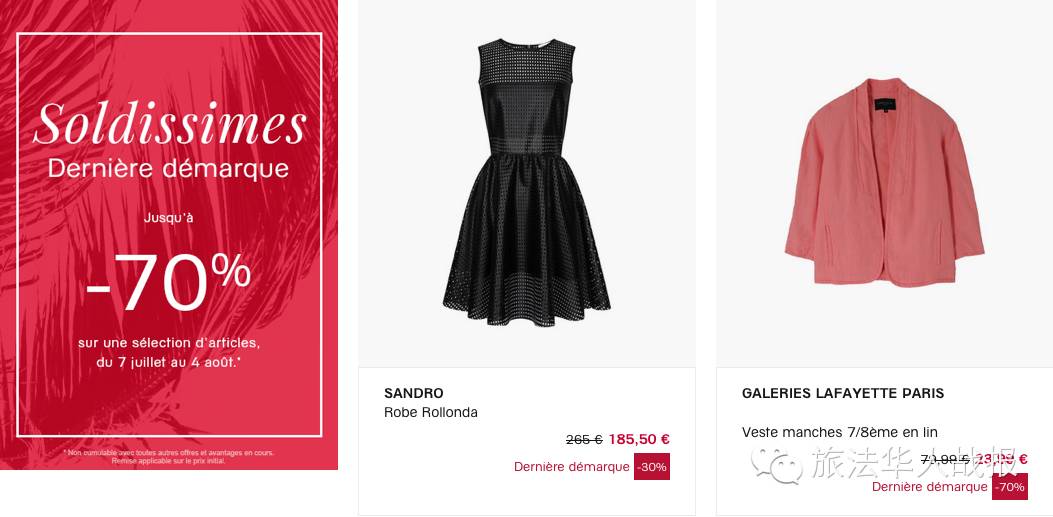 本次夏季打折从6月24日至8月4日,目前已经进入攻坚期。各大商场铆足了劲儿争分夺秒,抓住一天少似一天的机会,折扣力度对于剁手党来说,诱惑也确实是大大的。 老佛爷商场已经挂出减70%的诱人标语,当然类似Sandro这类热销品牌之中如图这款经典小黑裙,还是减不到那么大的幅度,不过想想平时的原价,也就足以令人咬牙拿下。