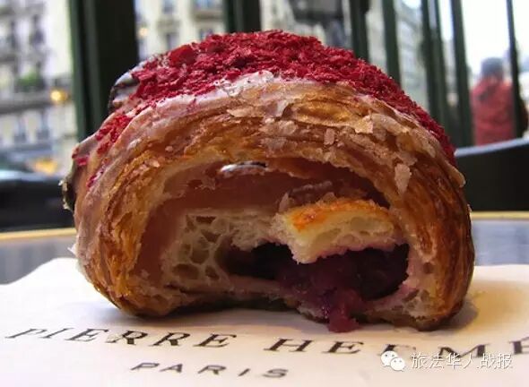 这种小点心有一个有趣的昵称叫“死苍蝇馅饼”,这是因为这种浓厚的奶油蛋糕中裹着许多小葡萄干。 Lonely Planet建议大家如果去到伦敦,可以跳过那些一般超市出售的Eccles cake,直接到伦敦的St. JOHN,那里的Eccles cake搭配Lancashire Cheese超棒的! 巴黎:Croissant Ispahan 伊斯法罕羊角包