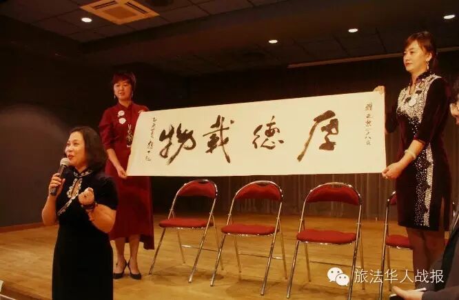 演出最后,佛山市女文艺家协会著名画家赵丁红为观众展示了中国传统书法表演——“厚德载物”四个大字,既阐释了中华文化的大气,也代表了中法两国友谊天长地久。赵丁红女士将书法现场赠予巴黎八区政府。 当晚,“同一片蓝天 同一个梦想”中法艺术交流活动在巴黎华东大酒楼举办庆祝晚宴。钱美蓉会长在致辞中表示,今年4月与巴黎八区区长涛特塞尔女士、巴黎六区区长勒考克先生回国访问,受到佛山市政府及深圳文化局、佛山女艺术家协会等单位的热情招待,深为祖国欣欣向荣的发展和日新月异的变化感到骄傲。本次夏少丽会长一行受八区政府之邀回访法国,为法国人民和旅法侨胞带来精彩的艺术展示,促进中法文化交流,这样的活动要经常举办,以弘扬中华传统文化,增进两国人民的了解和友谊。