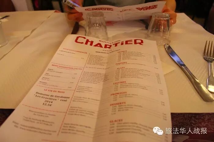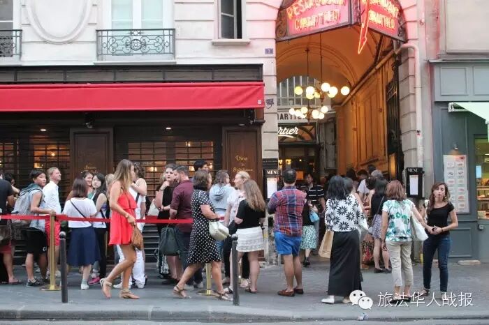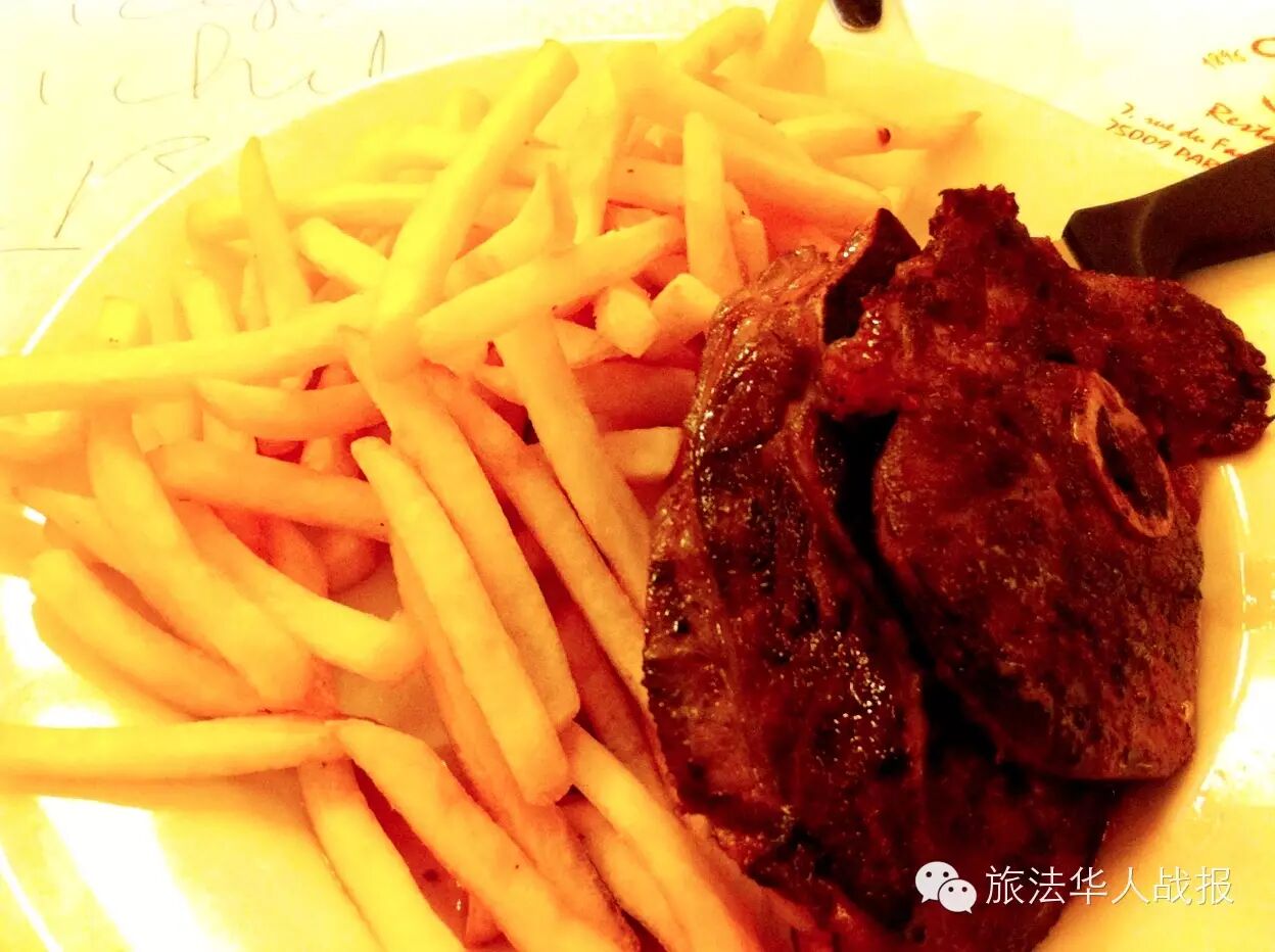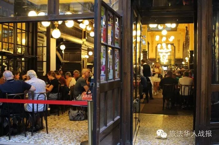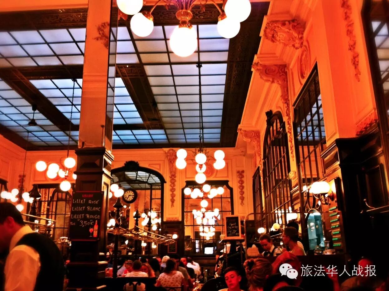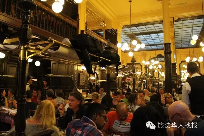 (新欧洲战报记者 陈星院) 我下班后倒了三趟地铁,就为了体验这家历史悠久、超有名气的百年老店的独特魅力。餐厅非常容易找到,从地铁站Grands Boulevards出来,走路一两分钟就到了,店门口大排长龙,辨识度很高。 很幸运,我和朋友赶到的时候,正好有几桌吃得心满意足的客人说笑着离开,我们只等十五分钟就找到了位置。店里不像一般巴黎餐厅那么朴素精致,倒十足是大食堂的架势:有320个座位的空间、金碧辉煌的吊灯、陈旧的法式挂钟、复古棕木的装饰…走进餐厅那一瞬间,竟有点穿越到百年前车站的感觉。 我们被服务员引到座位,举目望去,周围密密麻麻坐满了客人,我们没有位置另外“插足”,被安排与同是亚洲面孔的客人拼一张长桌。服务员示意我们把包放到头顶的架子上,抬头才发现每张桌子上方都有类似火车行李架的铁架子,客人们坐下后把包往头顶一放,坐下吃饭时立马就有了坐火车出游的感觉。