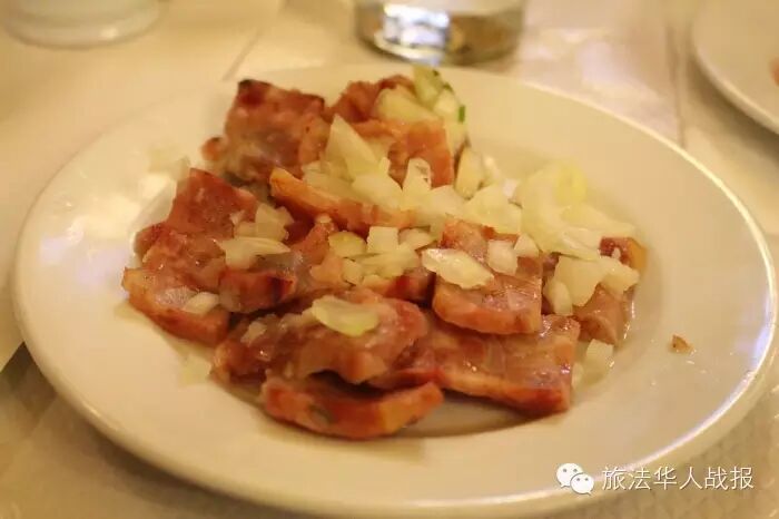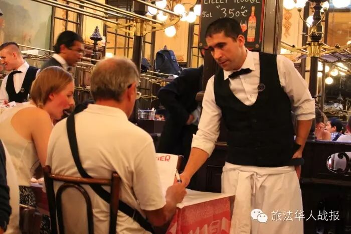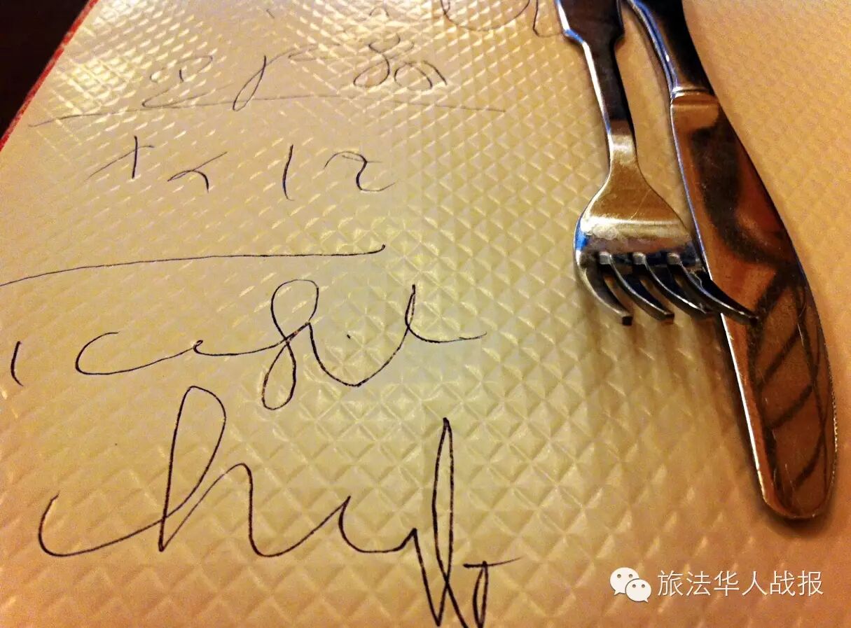 店里坐了不少外国游客,汉语、英语、德语、泰语等语言此起彼伏。有些客人虽然不会讲法语,点菜却也没有阻碍:服务员英语说得倍儿流利。服务我们的女服员叫Karina,在这家百年老店已经工作七年了,走起路来英姿飒爽,点菜也是雷厉风行,大大咧咧的作风可工作起来倒是很贴心,就连收个盘子的间隙也不忘给客人丢下一两句赞美:您真漂亮!