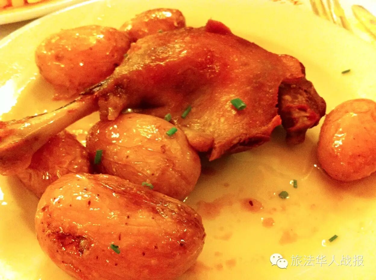 油封鸭腿是法餐的传统菜,也是这里的必点菜式之一,做得很入味儿,鸭腿个头不大,结结实实,鲜香不腻,不愧为法国人最爱的一道家常菜。不过我更爱吃鸭腿配的小土豆,吸收了油封鸭腿汁儿,真的太鲜美了,一盘六个简直不够吃…