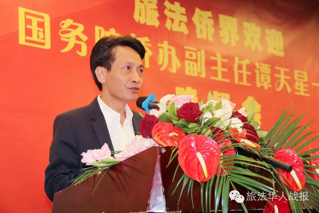 谭天星副主任在致辞中,代表国务院侨办和中国海外交流协会,向与会代表和广大侨胞致以衷心的问候和良好的祝愿。谭天星表示,这是首次在海外举办“和谐侨社建设论坛”,目的是总结经验,彼此借鉴,将侨务推向一个新高度。去年第七届世界华侨华人社团联谊大会上提出“惠侨八项计划”,包括侨团建设、华助中心、华教发展、中餐繁荣、中医关怀、文化交流、事业扶助、信息服务等,其中第一条就是侨团建设。和谐侨社对于侨胞力量的凝聚、事业的发展、形象的展示都有非常重要的作用,每位侨领都要做好表率,当好讲大局、人品好、有才干、肯奉献的带头人,带动侨界发挥整体力量,支持祖国和平统一,维护侨胞正当权益,促进中法友好交流。 谭天星在讲话中肯定了法国侨界团结一心的大好局面,并感谢大家多年来爱国爱乡、支援建设所做的突出贡献。谭天星提出,今后将继续开办侨领研习班,进一步建设华助中心,解决侨胞困难,促进融入帮扶。同时建议侨界设立华助基金,举办华助慈善晚会等,把为侨服务工作做得更好。