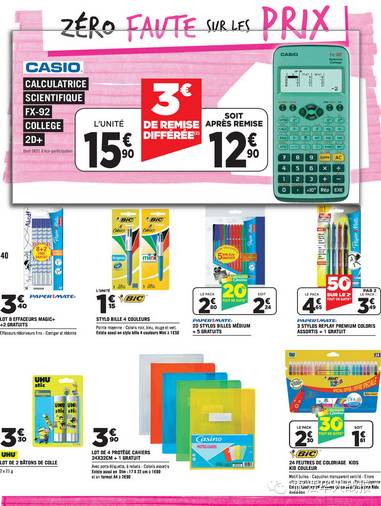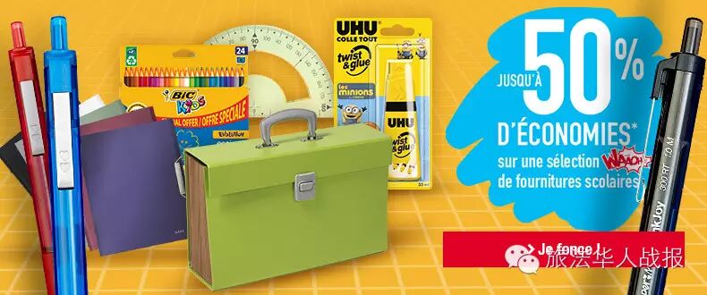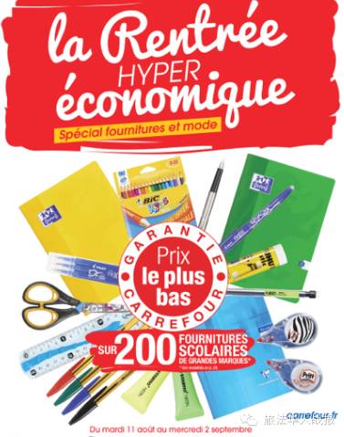 新欧洲战报记者 陈星院 众所周知,家乐福、欧尚等法国大型超市很多,虽然价格明争暗斗的情况时常有,但每家都便宜得各具特色。每年新学年来临之前,比如现下,各家超市的文具专区都纷纷挂出了促销的招牌。今天我们为大家列出一些优惠资讯供参考。 CARREFOUR 家乐福(CARREFOUR)是法国最大的综合性连锁超市,在世界29个国家和地区有万余店面,是欧洲最大的量贩业集团。同时,家乐福也是平价亲民超市,大优惠小折扣每天都有。 8月11日到9月2日,家乐福不仅推出很多文具打八折到五折优惠,而且今年文具比去年总体便宜2.7%~