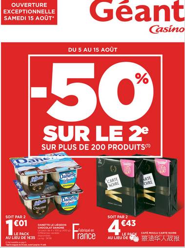8月15日之前,带着您的会员卡,很多商品可以享受八折到五折优惠哦!各种果蔬、点心、牛肉、兔肉、海鲜、酒水等都有大减价。比如黄瓜原价每根1.49欧,现价0.5欧;水果味小杯哈根达斯也打五折,两盒4.1欧。 E·LECLERC E·LECLERC是法国知名的大型百货超市,经营范围非常广,包括百货服饰、食品蔬菜、珠宝首饰、五金配件等。E·LECLERC目前打折商品有上千种。 8月5日到8月15日,E·LECLERC的部分文具折扣力度很大,很多贴着黄色标签的文具都有30%到50%的优惠,例如文件夹原价2.7欧,现价1.35欧;科学计算器保修三年,原价8.9欧,现在立减2.25欧。 Géant Casino 据法国消费者协会UFC在全法3833家超市进行的调查显示,位于boulevard Masséna的Géant Casino是巴黎唯一一家低于全国平均价格的超市。购买80件消费者日常所需商品,全国平均价格为377欧,这家为350欧。