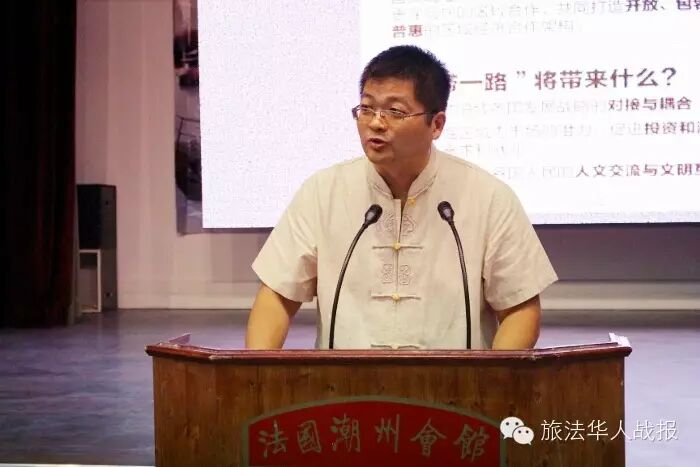 (新欧洲战报记者 陈星院)8月14日下午,杭州市公共外交友好使者周震、牛曙坤、周子琳、张海龙一行14人抵法访问,受到法国潮州会馆的热情接待,双方在潮州会馆举办《巴黎访亲》座谈会,以“一带一路”主题为重点,进行中法经济、文化等话题的互动与交流。 法国潮州会馆会长、杭州市公共外交协会副会长吴武华,法国潮州会馆监事长许葵及多位副会长,以及欧洲时报常务副社长钟诚,欧洲杭州华人华侨妇女联合会秘书长武京平、副秘书长盛开,法国广东会馆执行会长马致远,他曲互助会会长林楚电,崇德校友会会长陈梦膺、永远名誉会长李永德,寮都校友会会长邓继华,寮都师生联谊互助会会长马楚海,番禺富善社社长陈文鸿等与会。