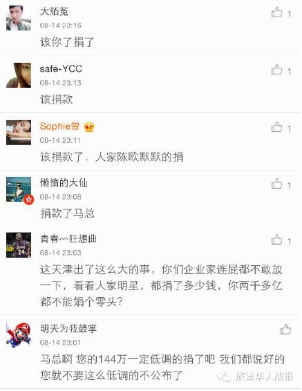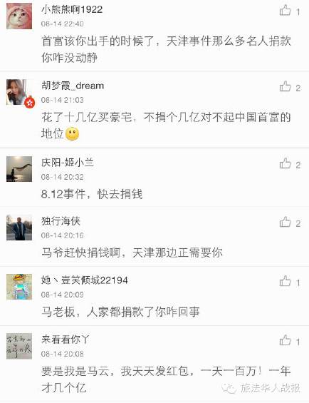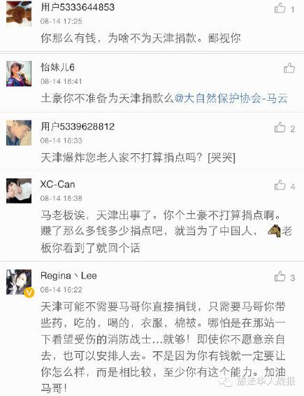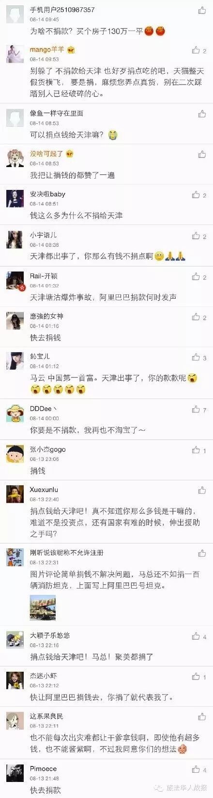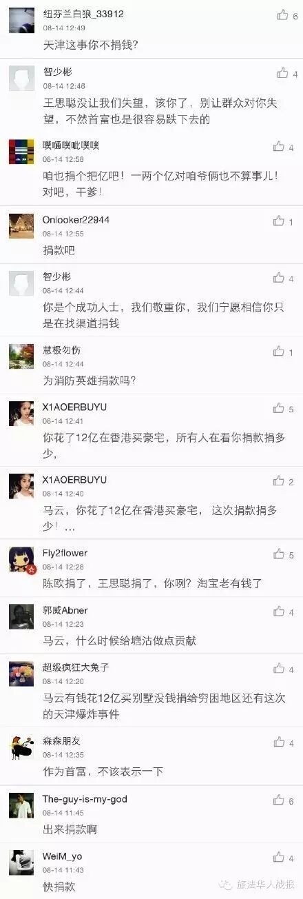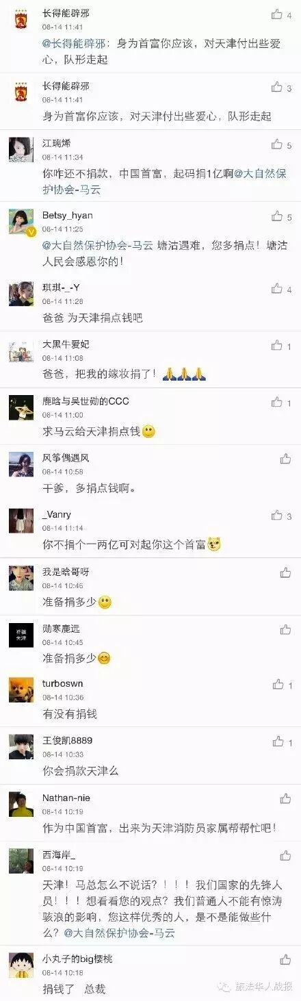阿里巴巴集团董事局主席马云,成立有阿里巴巴基金会和马云公益基金会,并在汶川地震、玉树地震、雅安地震等灾难中多次捐款,帮助受灾地区。2014年胡润慈善榜显示,马云以145亿元捐赠额成为“2014中国最慷慨的慈善家”,同时成为“2014大中华区最慷慨的慈善家”。 8月12日天津塘沽发生爆炸,截至16日上午已有112人遇难。事故发生以来,社会各界发动爱心捐助。“中国首善”马云的动静引人关注,其新浪微博也炸开锅。 逼捐派