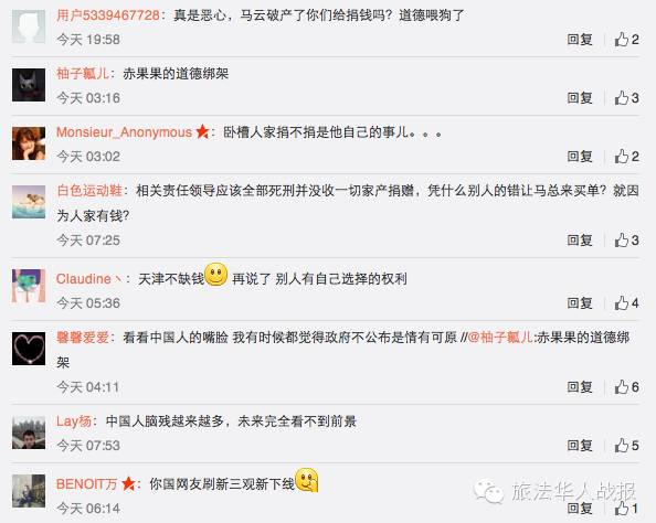 挺云派 但与此同时,也有不少网友不满这种“逼捐”现象,痛斥这是道德强*奸,简直就是勒索。 易能传媒新欧洲的新浪微博@新欧洲战法 亦关注这一话题,网友各抒己见,留言挺马云者也不在少数。有人直斥“国民素质堪忧”,是“道德喂狗”,“民众还活在打土豪分田地的年代”,简直“刷新三观下线”。 也有理性派表示,“为什么首富就一定要捐钱呢?为什么首富就一定要捐的比别人多呢?马云的财产有自己分配的权利,网民又有什么权利凌驾于道德之上去指责不捐的人呢?难道捐的多的就比捐的少的有道德吗?”