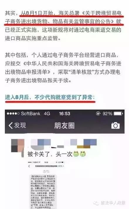 (新欧洲战报综合消息)最近有一条《代购迎来前所未有危机:9月1日海关实施新政策》的文章刷爆了代购们的朋友圈: 文章中提出,8月1日起,海关总署《关于跨境贸易电子商务进出境货物、物品有关监管事宜的公告》已正式实施。 下文又不知道从哪弄来截图造成感觉上下文有直接关系的样子,很容易让人将两件事情联想到一起。 是啊,现在确实是8月份,但上文所说的“8月1日起,海关总署实施的《关于跨境贸易电子商务进出境货物、物品有关监管事宜的公告》”中的“8月”是2014年的8月好吗?