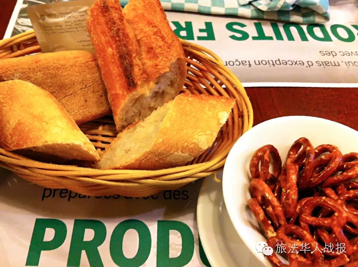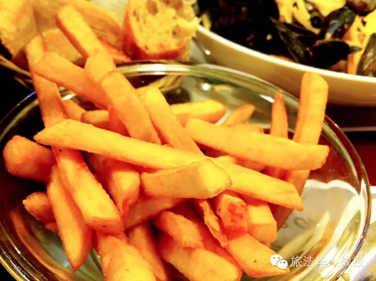 淡菜上来之前,先送上切成段的法棍面包和餐前小点,包括套餐里的薯条,薯条可以续。