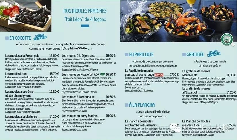 据说吃淡菜一定要配薯条,传统淡菜用白葡萄酒、洋葱、西芹等煮出来,鲜美多汁,配上炸得恰到好处的薯条,两者成为绝配。此外,正宗吃法还要配上泡沫丰富的比利时啤酒。 淡菜其实是一种贝肉,也叫青口,在中国北方俗称海虹,还有个雅号叫“东海夫人”,蛋白质含量超级高,据说高达59%。在Léon de Bruxelles,淡菜有用小锅煮的,有加芝士烤的,有锡纸锅式的,也有西班牙海鲜式的。 建议第一次吃的朋友试试小锅煮法,有白酒、奶油、蕃茄等等不同锅底。很多去过的同事推荐白酒煮法。这些淡菜每天清晨从比利时空运过来,配上香蒜、欧芹和洋葱,再加一点醉人的法国白葡萄酒,当它被服务员呈上桌的时候,你会看到满满一锅淡菜都张大着嘴巴,露出肥美多汁的嫩黄肉,空气中弥漫着甜美的酒香。我们隔壁桌的一对情侣要了两个锅子,吃完以后还不忘用面包蘸汤汁,实在是解馋!