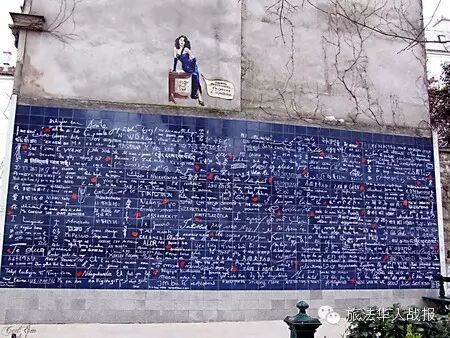 Le Mur des Je T'aime 情人节,去蒙马特高地的爱墙跟TA牵手、拥抱、接吻再合张影吧! 巴黎爱墙,于2001年情人节当天落成,由法国音乐人巴隆一手创立,是情侣的经典定情之地,坐落在Abbesses地铁口对面的小公园。爱墙由511块深蓝色长方形石砖组成,墙上写满“我爱你”,据说包括311种字体和280种语言,墙壁左侧可以找到三个竖排的中文。