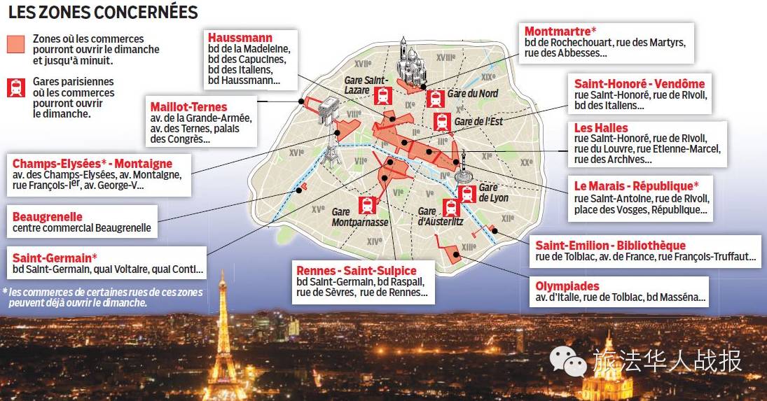 (新欧洲战报记者 鲁佳)由法国经济部长马克隆(Emmanuel Macron)主推的《促进经济增长、活动及机会平等法案》,亦即我们俗称的“马克隆法案”近日闯关成功,共308项条款中的九成以上被宪法委员会批准。其中,最令华人华商关注的周日营业法案也尘埃落定:巴黎规划6所大型车站及12块国际旅游区(ZTI)获准在周日营业,日常营业时间也可延长至午夜12时。 6所大型车站