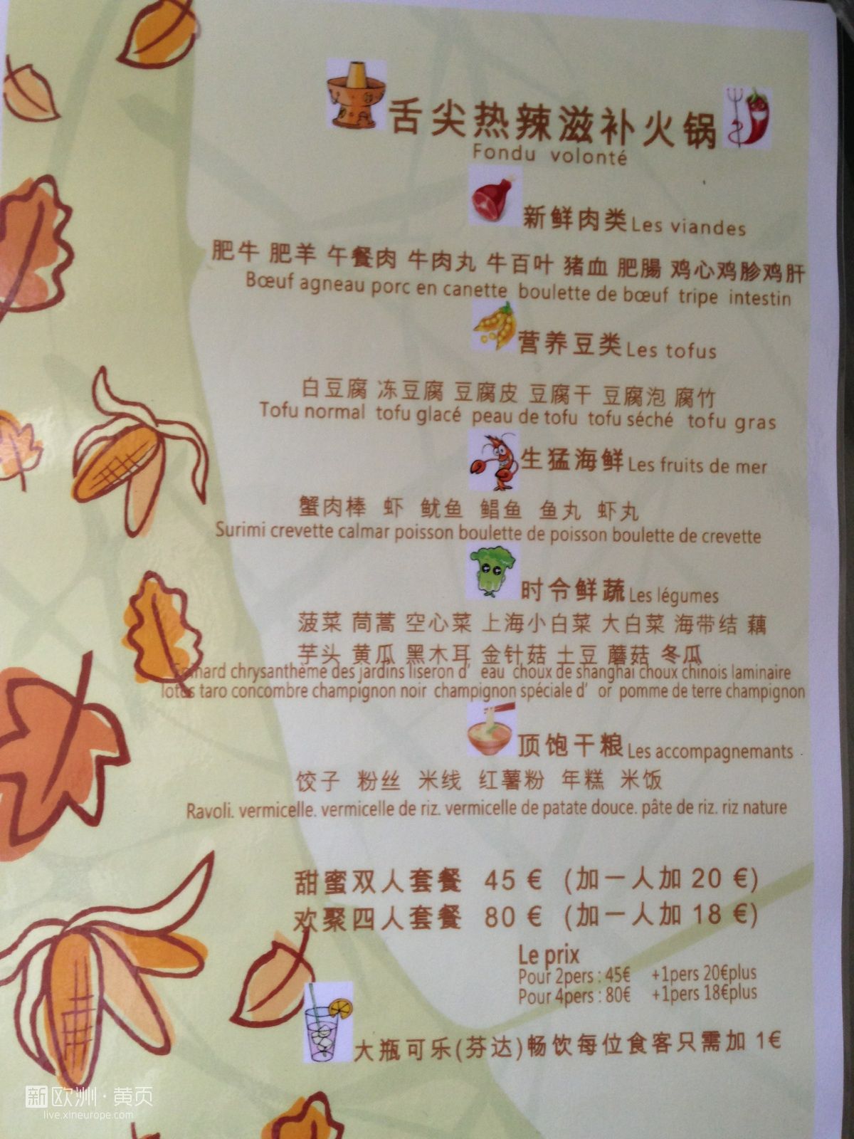 ▲23.8€/人,吃到饱! ▲吃饱喝足唱起歌 地址:59 Rue de Clery 75002 Paris 地铁:4/8/9号线Strasbourg Saint Denis或3号线Sentier 营业时间:周一至周五18h30-23h,周六周日午12h00-15h30,晚18h30-23h 御膳坊 御膳坊宫廷火锅,一人一锅的自助火锅,特聘宫廷御膳坊传人作主厨,主打明清风格和纯正的御膳文化,在巴黎众多的火锅店中独树一帜,颇有格调。 丰盛的火锅汤底可供选择:口味轻重可调的麻辣火锅、滋补养生的老母鸡汤火锅、清淡口味的味增火锅、独家秘制的羊骨汤火锅(只限周五至周日供应)。 ▲特别推荐滋补养生的老母鸡汤火锅哦,补一补! ▲肉类、海鲜、蔬菜和酱料应有尽有 ▲御膳坊还独家推出特色饮品:自制冰茶(原味,柠檬,冰姜,冰桃,香瓜等多种口味),宫廷养生茶和高山茶。 地址:32 Rue d'Hauteville 75010 Paris 地铁:8/9号线 Bonne Nouvelle 营业时间:中午12h-15h30,晚上18h-23h 一家火锅 巴黎的明星火锅店,谢霆锋来巴黎录节目的时候来的就是这家哦。 (图片出处见水印) 虾滑、鱼滑、秘制鸡肉,还有店家自制的酸梅汤是特色,一定要点。 一家火锅有丰富的麻辣菌汤锅底:四川麻辣锅、滋补清汤锅、一品菌汤锅、沙茶锅,以及地道的麻油、沙茶、芝麻蘸料。 人均:20-25€ 地址:27 Rue d'Enghien 75010 Paris 地铁:8/9号线 Bonne Nouvelle 营业时间:11h30-15h,18h-23h(周一至周四中午休息) 鸿福记 没想到会在巴黎第一次见到“烤涮一体”火锅+烧烤组合,简直太满足了,价格也实惠! ▲上有火锅,下有烧烤