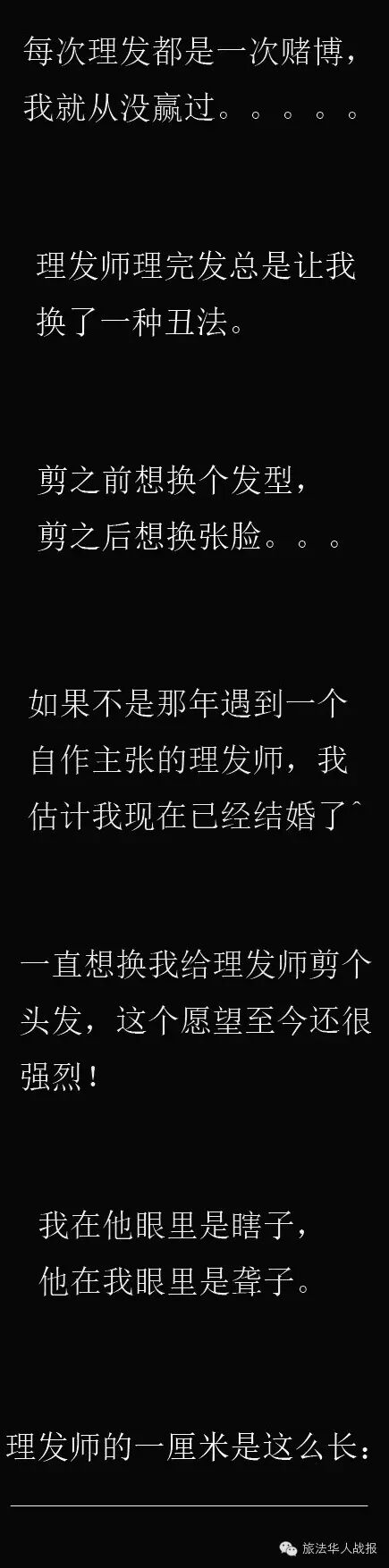 《20 minutes》说,虽然理发店音乐high起来了,不过大家轻易还没有舞蹈起来,只是一些客人洗头的时候会跟着哼歌或用脚打节拍。 感觉就这样也是挺危险的,毕竟不哼歌也不用脚打节拍,认认真真剪个头发,都轻易没有满意过。跟理发师的恩怨情仇,说起来都是泪:
