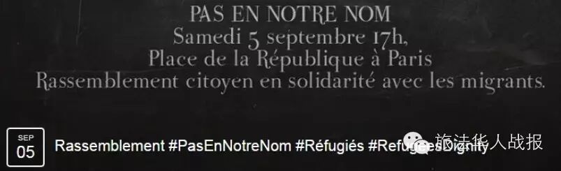 截至战报发稿,已有1.7万人签名决定参加周六共和国广场集会。 地址:Place de la République 75011 Paris 活动页面: https://www.facebook.com/events/115934458759304/ 同时,在卡昂、维埃纳、鲁昂、马赛等地,也会开展声援难民的活动。 |