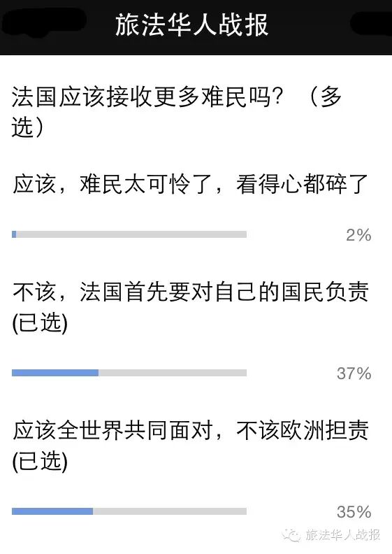 根据Odoxa近日的民调,52%法国民众反对政府打开国门、放松难民身份关卡。根据新欧洲新闻平台旅法华人战报所做的调查,法国华人群体持这一态度的也占绝大多数。
