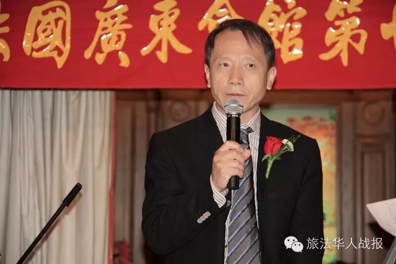 中国驻法使馆领事部一等秘书李京生在致辞中向法国广东会馆表示热烈祝贺,充分肯定会馆成立26年来,在联络乡亲、敦睦乡谊、维护权益、扶持侨胞融入法国社会、弘扬中华文化、增进中法两国人民相互了解等方面所做的工作。他称赞广东籍侨胞时刻关心家乡的建设和发展,热心捐助各项公益事业,并为法国华社的发展壮大做出了重要贡献。 李京生表示,今年是纪念反法西斯战争胜利七十周年的历史性时刻。回顾历史,旅法华侨华人在抗击法西斯战争中有着不可磨灭的作为。他希望后辈能铭记历史、缅怀先烈、珍爱和平、开创未来,秉承前辈爱国爱乡的传统,积极参加法国侨界的各项活动,进一步团结和服务乡亲,密切与祖籍国的联系,充分发挥中法两国经济、文化交流的纽带作用。最后,祝愿法国广东会馆的会务发展顺利,会员事业欣欣向荣。