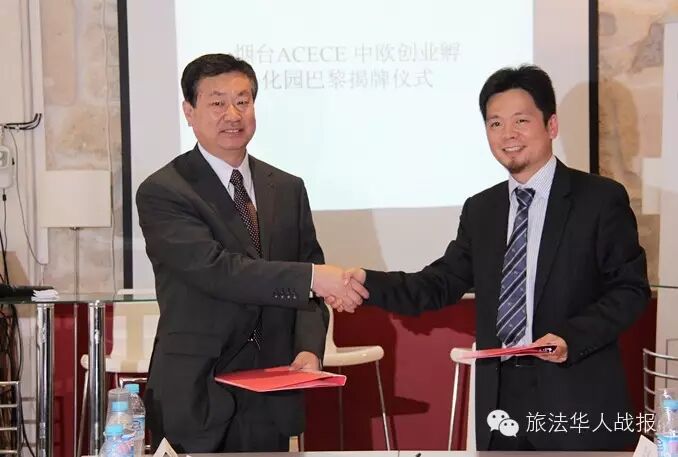 9月8日,烟台-ACECE中欧企业孵化园巴黎揭牌仪式同期举行。烟台市副市长王晓敏一行七人来到巴黎,与法国海外留学人员创业者协会主要成员就中欧孵化器建设情况及未来计划进行座谈,并实地考察巴黎孵化器。随后,王晓敏副市长与李天伦会长共同为孵化园揭牌,李天伦还与烟台市人社局局长董希彬签署了合作协议。